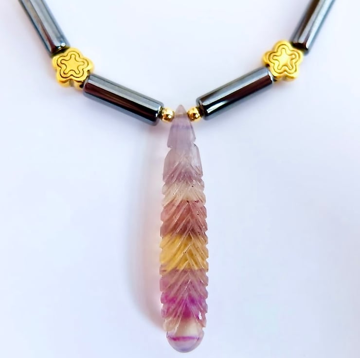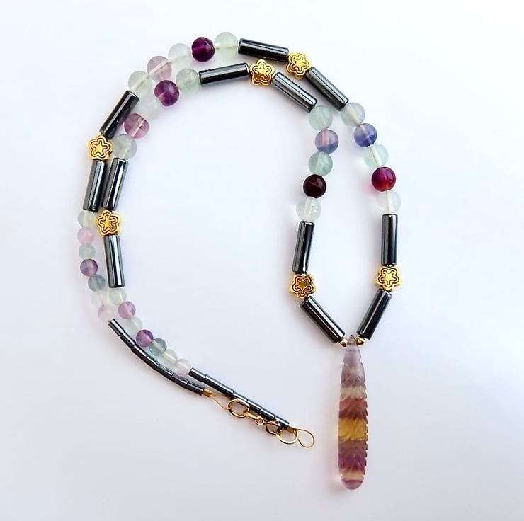 This striking necklace features a 40mm x 8mm carved rainbow fluorite drop pendant with bands of lilac, yellow and pink colour.