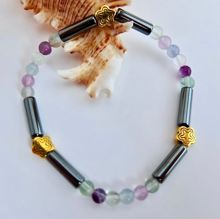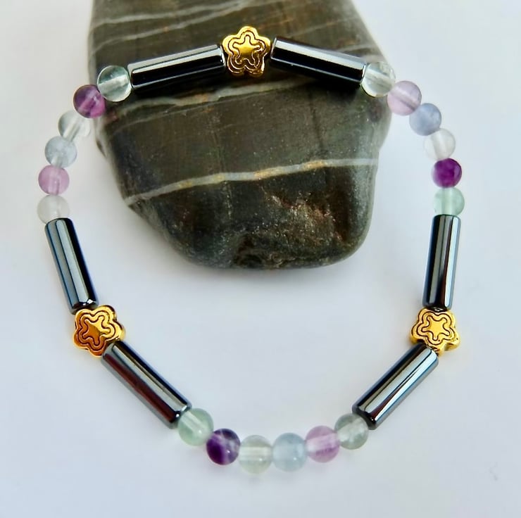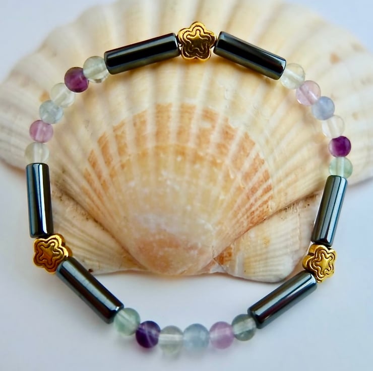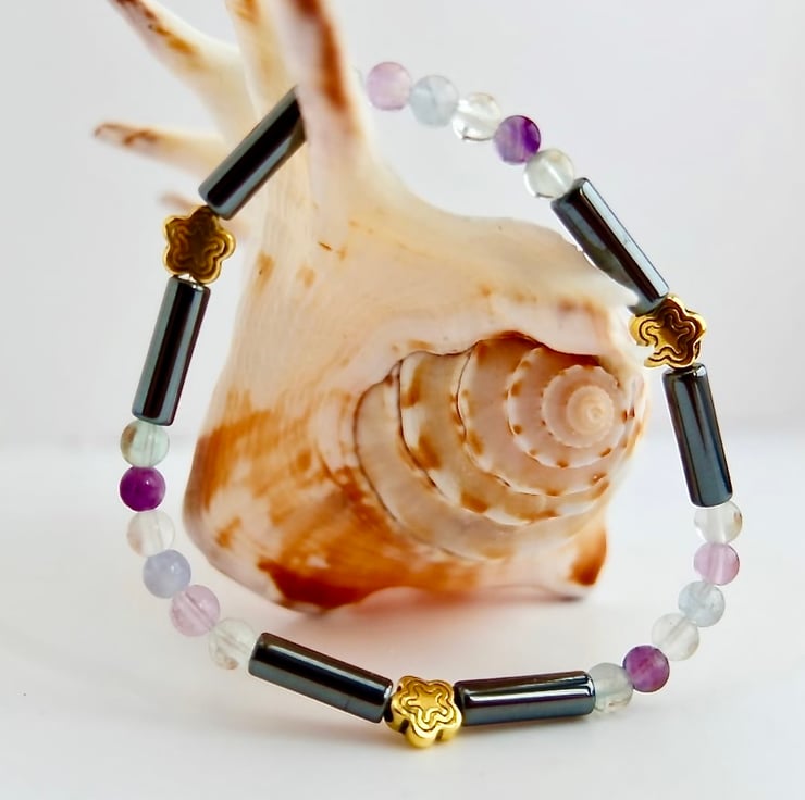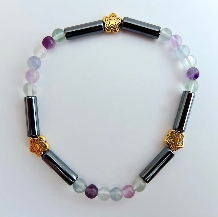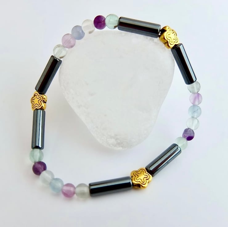 Hematite tubes, 4mm x 13mm, separate 4mm fluorite beads in pastel shades of green and purple.