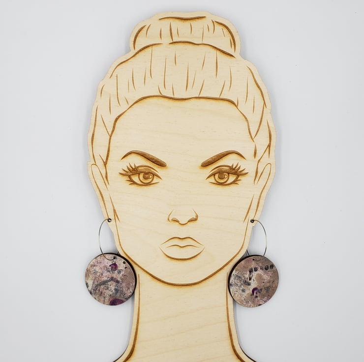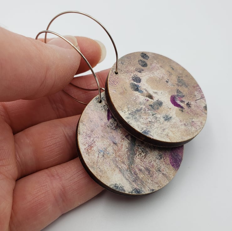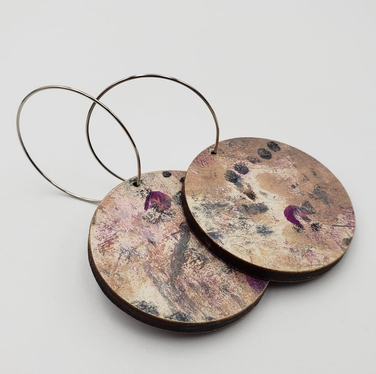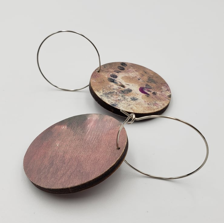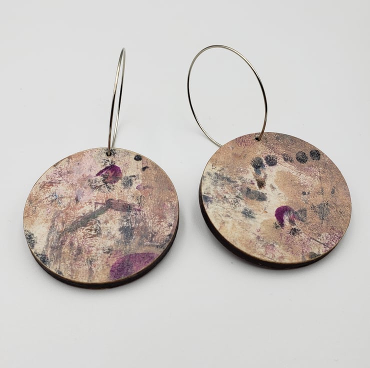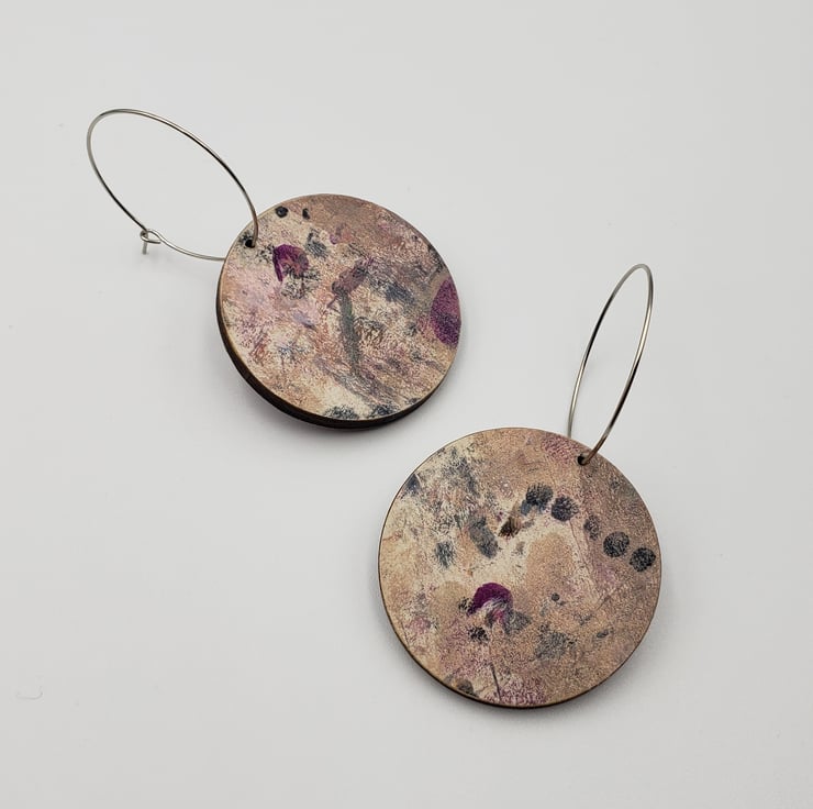 Pretty rose pink, grey and white earrings which have been hand printed in an abstract pattern. The back of the earrings are printed in the same colours but a plain print to co-ordinate with the front. Very light to wear.