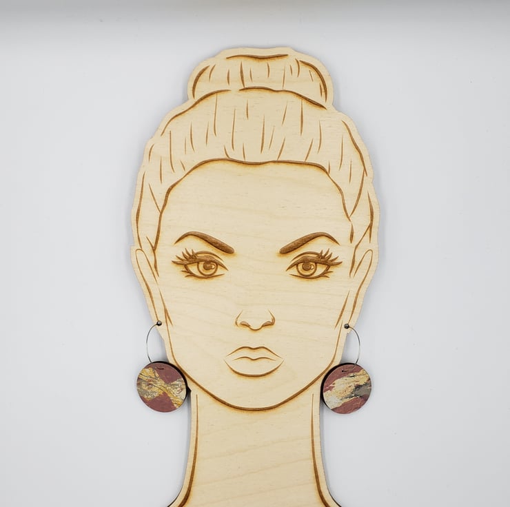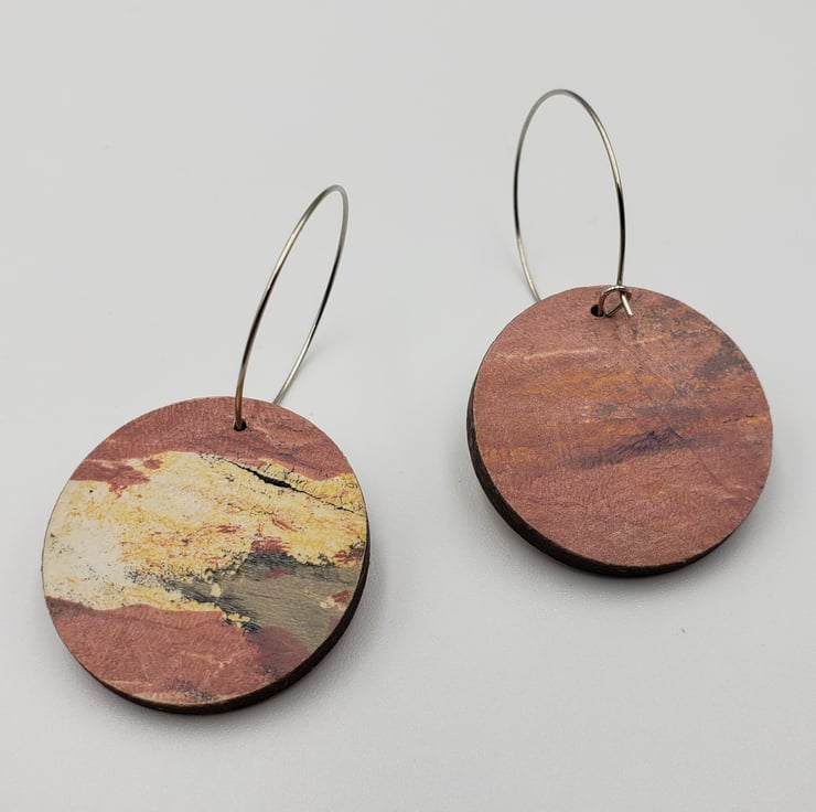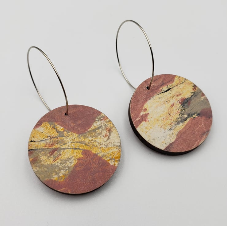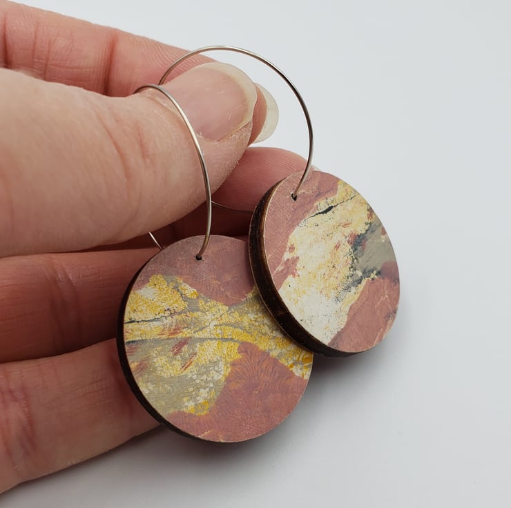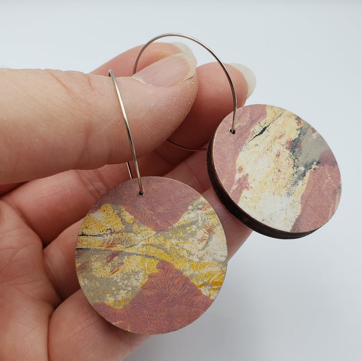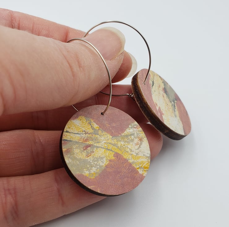 Small Rose pink, grey, yellow and white wooden printed earrings, which are very light and easy to wear during the day or evening. The design was hand printed by me then a coat of varnish to protect.