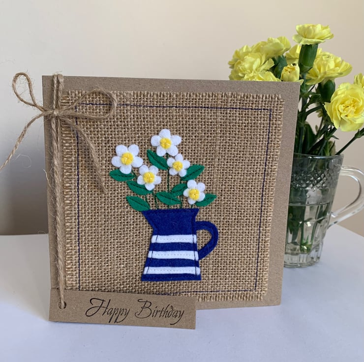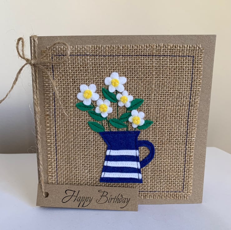 This card is decorated with white flowers in a blue and white striped jug. The decoration is hand cut from felt. It is then sewn by hand and machine onto a hessian background.