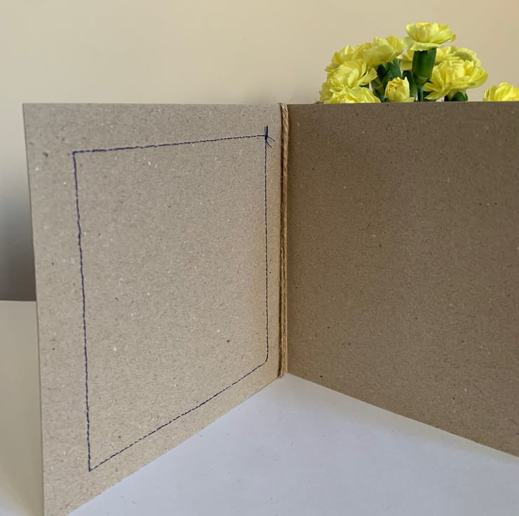 The hessian is machine stitched using a contrasting thread, onto a plain brown recycled card. This stitching is visible on the inside of the card.