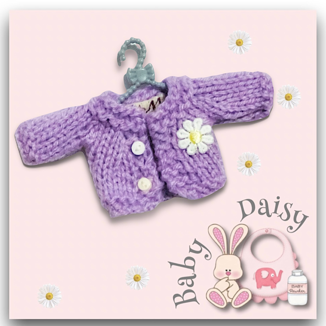A pretty lavender cardigan, decorated with a little daisy to fit baby Daisy. The cardigan is hand knitted and comes on a cute little hanger.