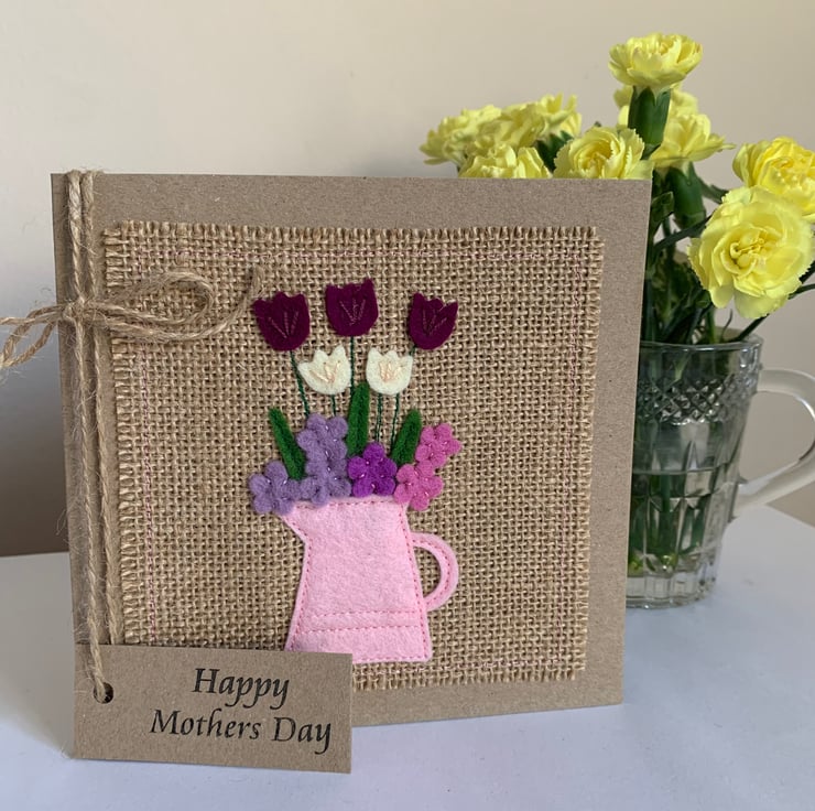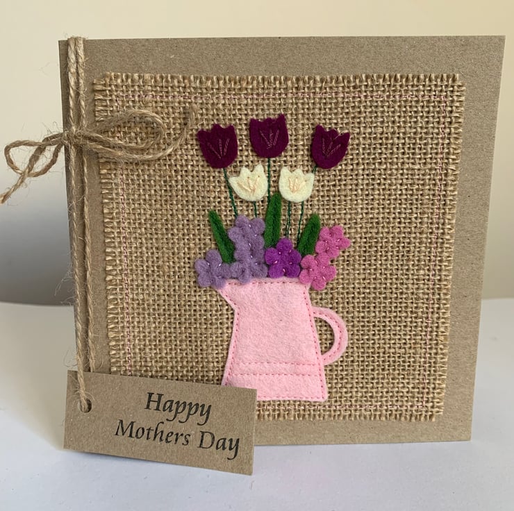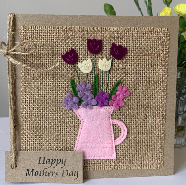 This card is decorated with mulberry purple, cream, lilac and deep pink flowers in a pale pink jug. The decoration is hand cut from 100% wool felt. It is then sewn by hand and machine onto a hessian background.