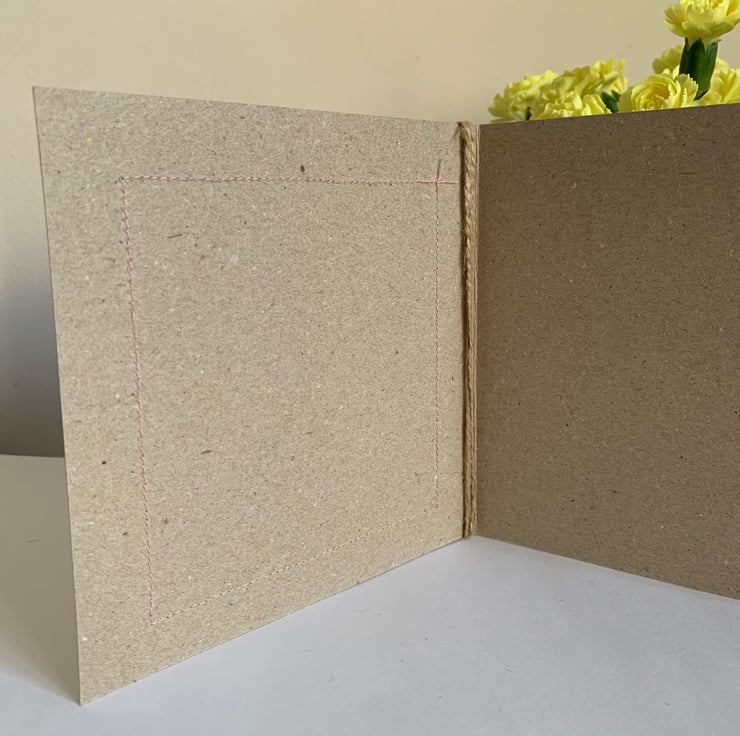 The hessian is machine stitched using a contrasting thread, onto a plain brown recycled card card. This stitching is visible on the inside of the card.