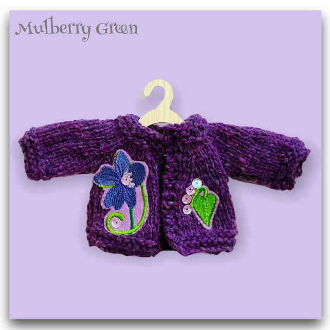 A beautiful embroidered purple cardigan, hand knitted in Drops soft tweed, to fit the Mulberry Green characters. The cardigan is embroidered with lovely purple flowers and decorated with sequins. It looks lovely with the dresses in my shop.