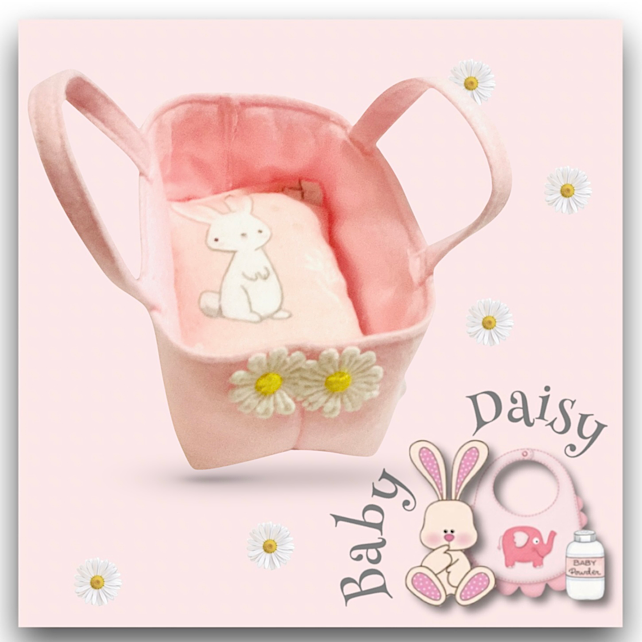 A sweet little pink carrycot for baby Daisy. The carrycot is handmade from double stitched felt with a padded base in a cute little rabbit print. It is decorated with pretty daisies and is perfect for taking your baby Daisy on an outing or popping her on for a little nap.
