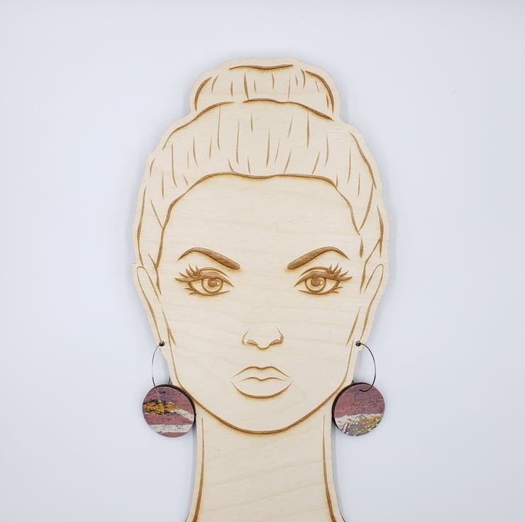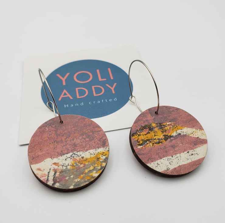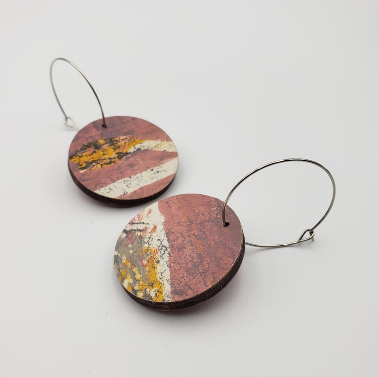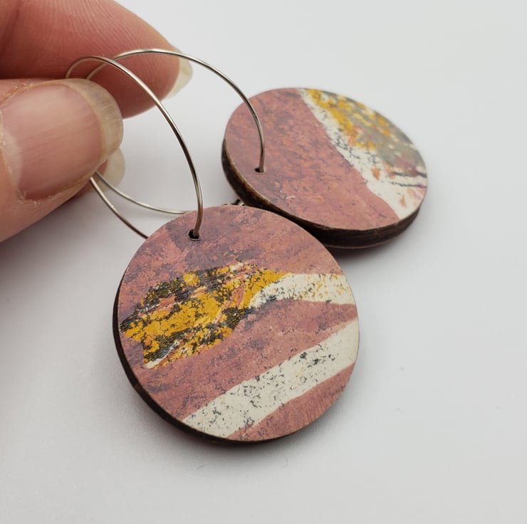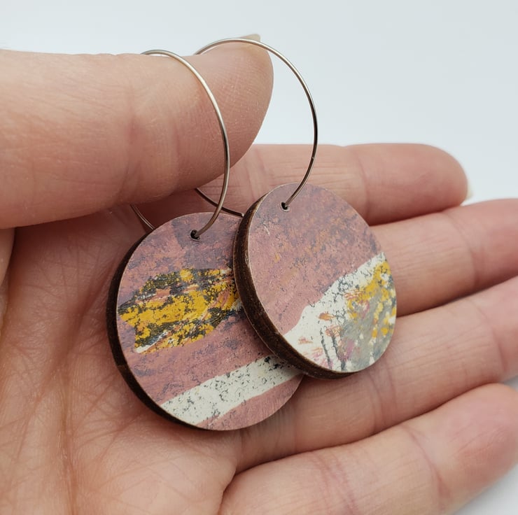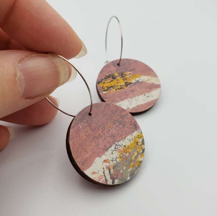 These pretty rose pink, ash grey, yellow/orange and white abstract earrings are very light to wear, hand printed by myself and protected by a coat of varnish. The print is different on each earring but work together as a complete pair.