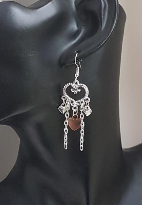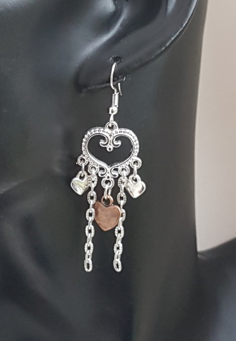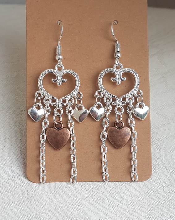 A lovely and unusual pair of dangly earrings. Beautiful heart shaped chandeliers with dangly Silver plated chains, Silver tone small hearts and lovely copper tone heart charms. A great gift for those who love unusual jewellery.