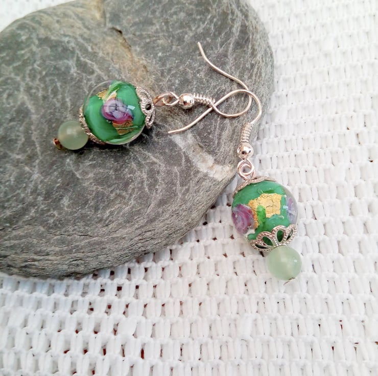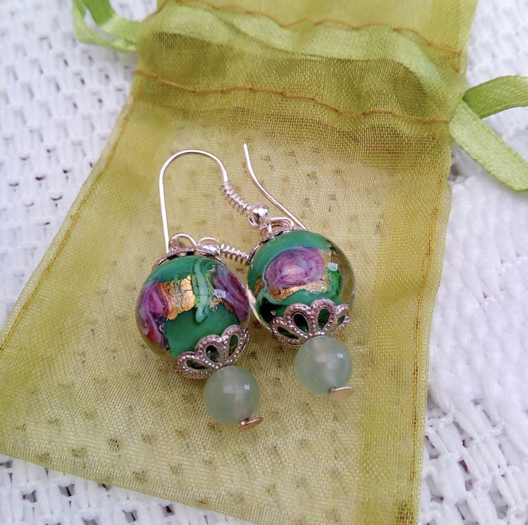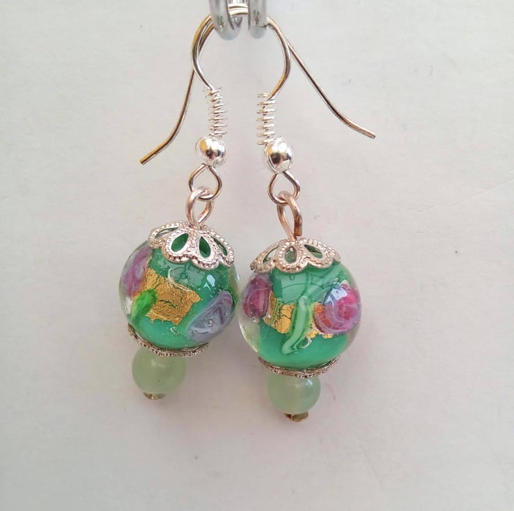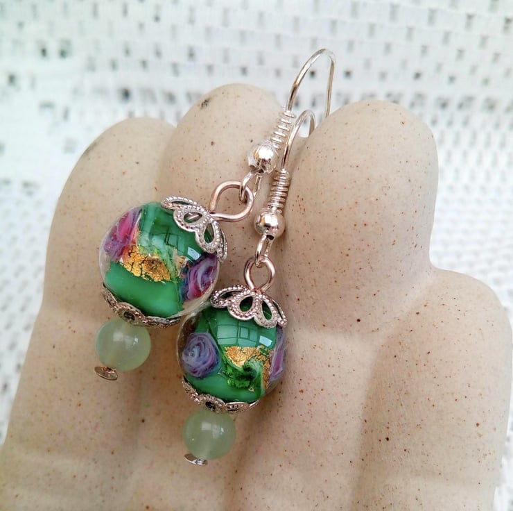 These very pretty earrings would look great with any outfit you wear everyday or for a casual evening out. They would make a lovely gift for a friend or relative, for a birthday or anniversary or a lovely treat for yourself. They are made using a 12 mm glass lampwork bead with a pretty green floral centre and a 6 mm pale green glass bead. The larger bead is enclosed at the top and bottom in 2 silver plated bead caps. They are suspended on silver plated hook ear wires and they have a drop of 2.5 cm from the base of the ear wire. The earrings will be dispatched wrapped in tissue paper in an organza bag and delivered to you via Royal Mail first class post.