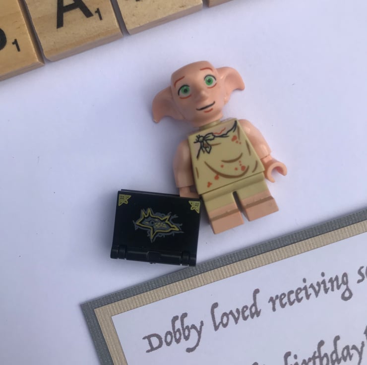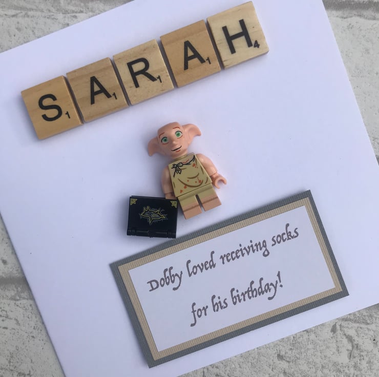 Made by myself in Northamptonshire it features wooden scrabble tiles and a mini figure of Dobby which are stuck onto white card stock.