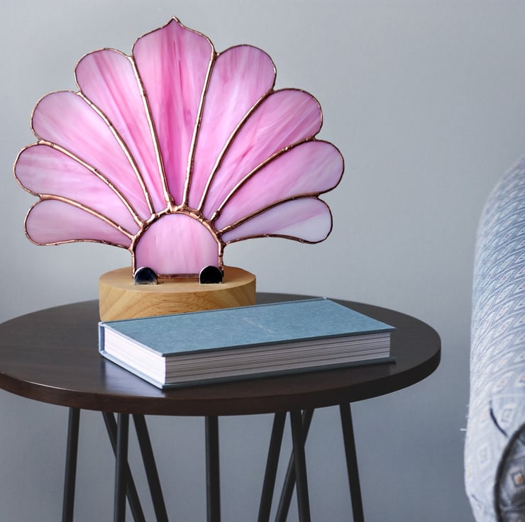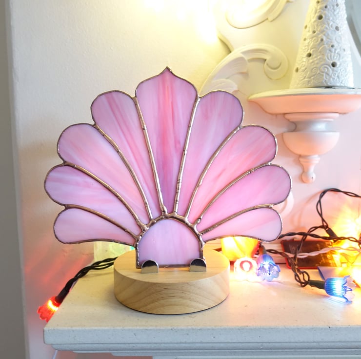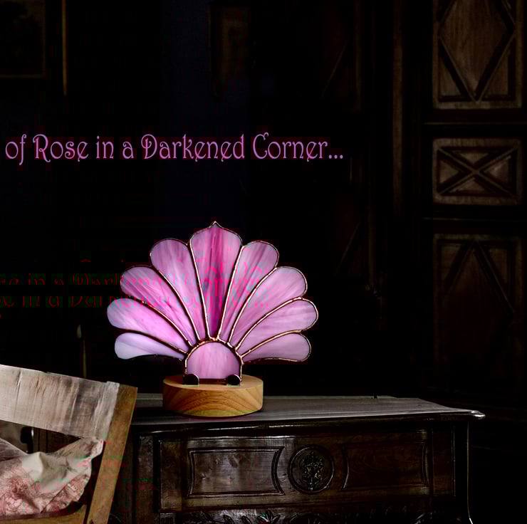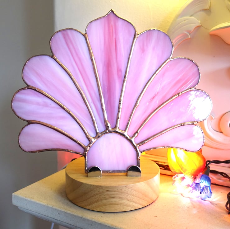 This lovely Art Nouveau style lamp is made from rose pink streaky Wissmach glass with an antique copper finish to the solder. It rests on chrome holders on a wooden base that is fully wired with a UK plug and specifications.
