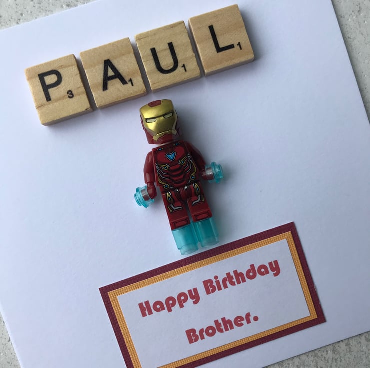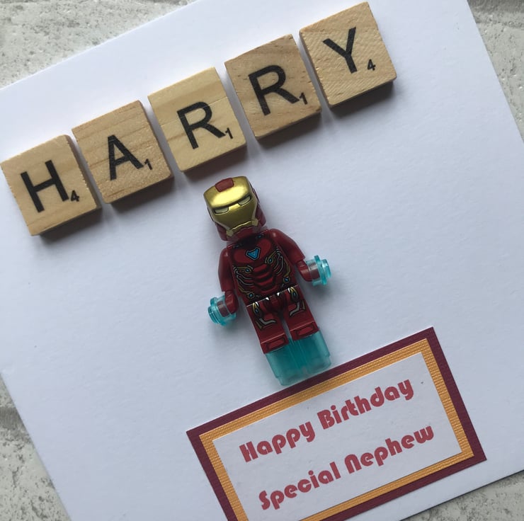 Made by myself in Northamptonshire it features wooden scrabble tiles and a mini figure of Iron man / Tony Stark which are stuck onto white card stock.