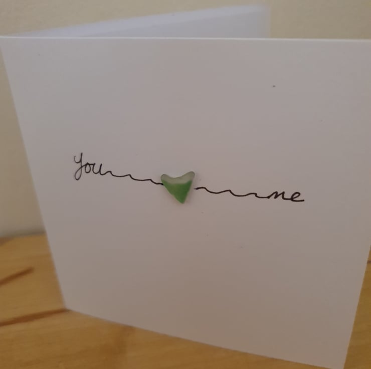 A perfectly formed heart sea glass piece sits in the middle of the words 'you - me', the seaglass is a very unusual piece of green which fades to clear at the top of the heart, card measures 4x4" and has a paper insert which reads 'Love Always', supplied with an envelope