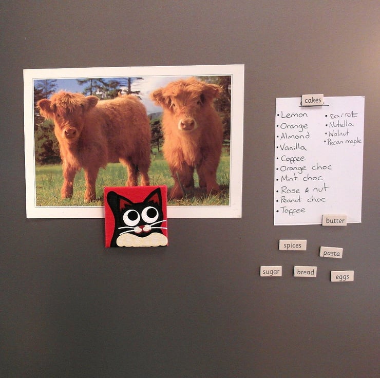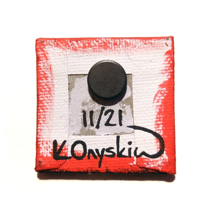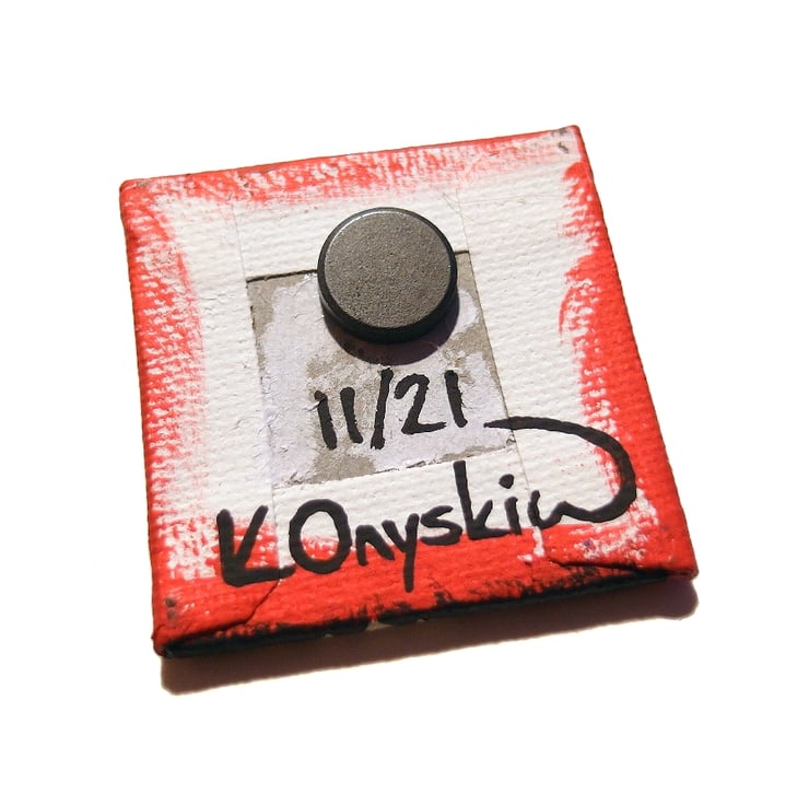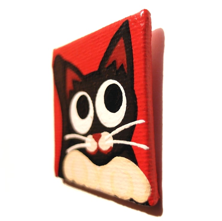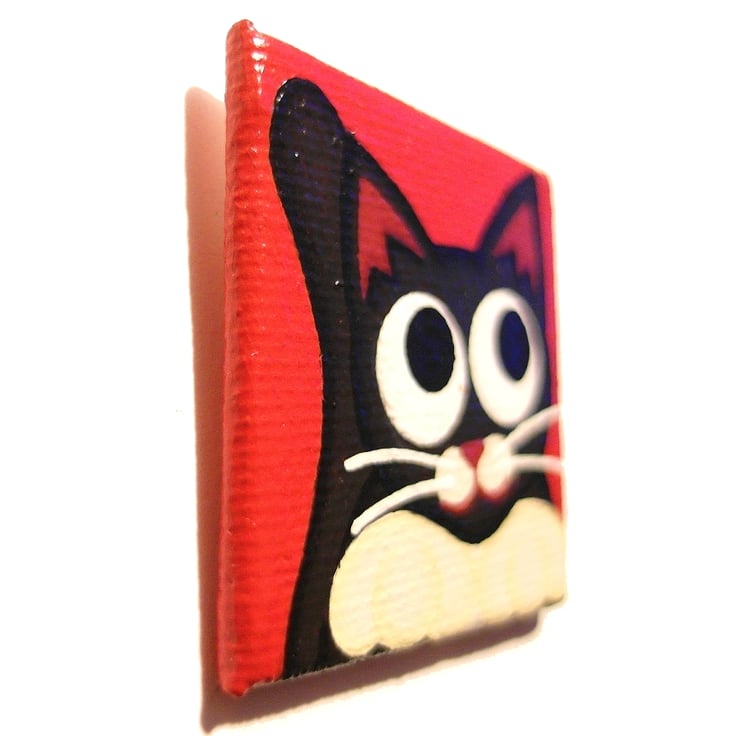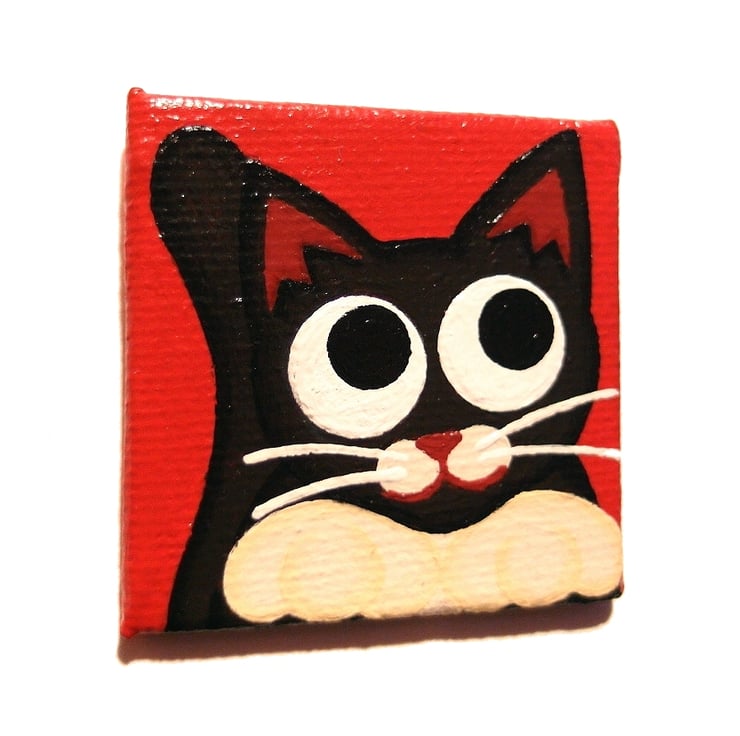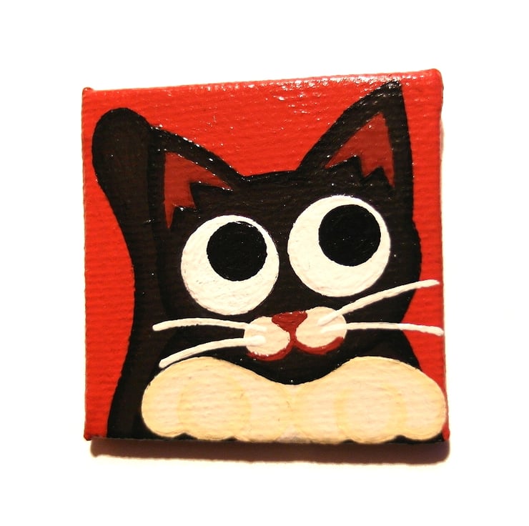 This small cartoon cat art is painted in acrylics on a 5cm x 5cm (2" x 2") canvas board, and has been coated with a layer of clear varnish to make it more durable. A 12mm magnet is attached to the back so this little artwork can stick on a fridge or other magnetic surface.