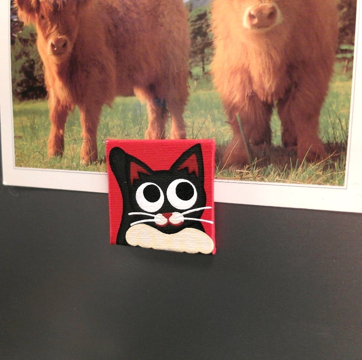 A small fridge magnet with an original painting of a cute black and white cat. The cartoon cat has a white moustache, bib and paws, and is stood with its paws on the edge of the canvas and is curiously looking around with big eyes. The cat is painted against a red background.