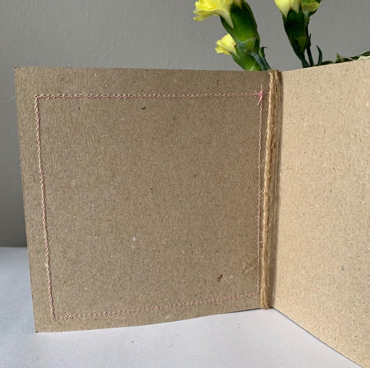 This hessian is machine stitched, using a contrasting thread, onto a plain brown recycled card. This stitching is visible on the inside of the card.