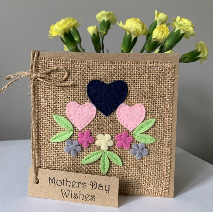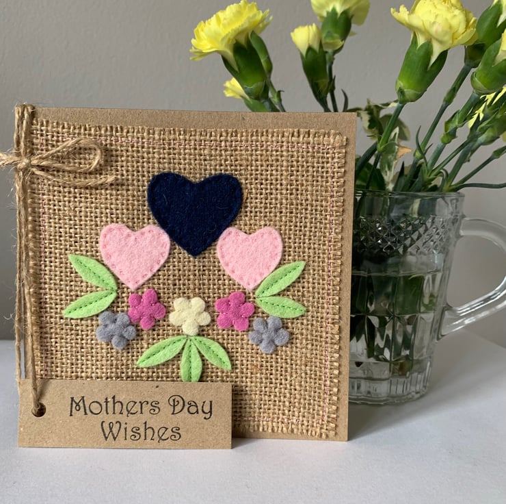 This card is decorated with pink and navy blue hearts, with contrasting flowers in rose pink, cream and grey. The decoration is hand cut from 100% wool felt. It is then sewn by hand and machine onto a hessian background.