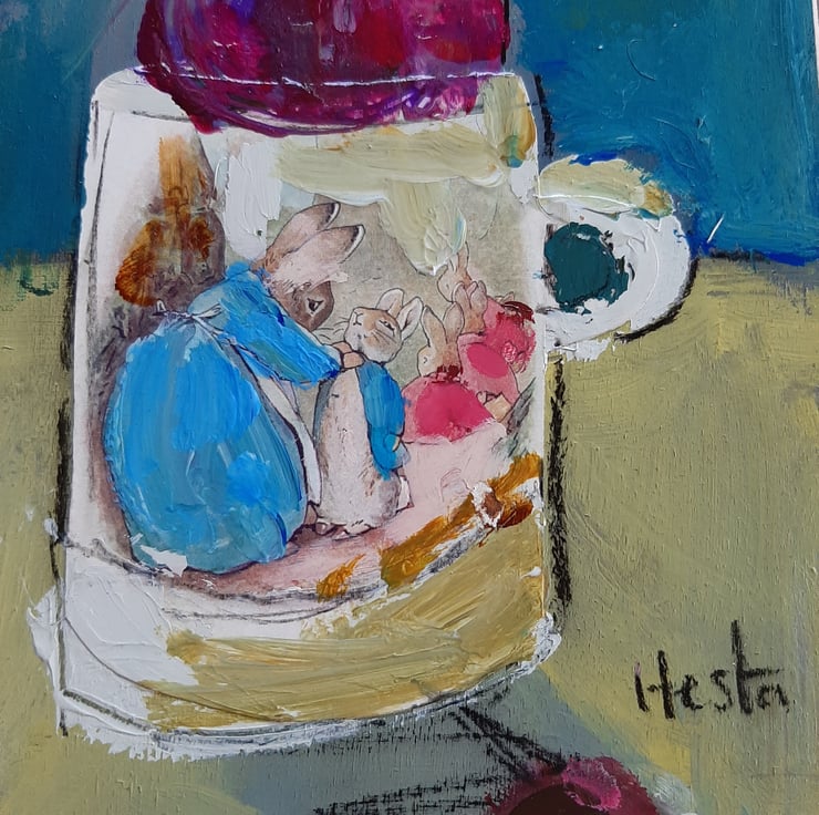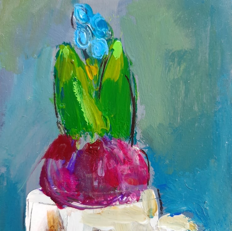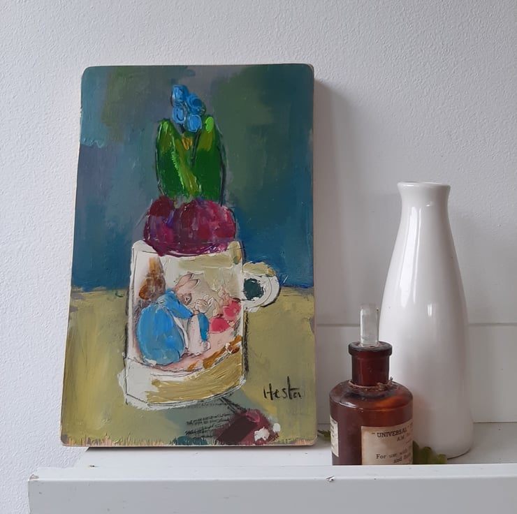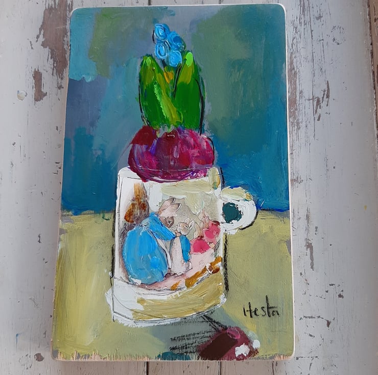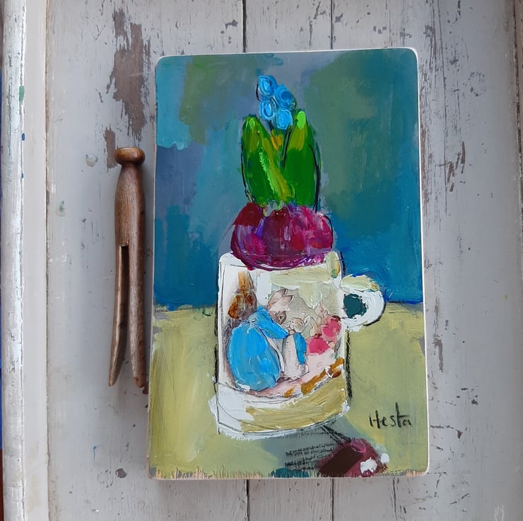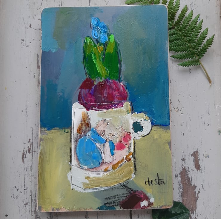 Everyone loves Peter rabbit. This is a jolly happy painting with collage, bring the joy of spring with a hyacinth waiting to burst open. I have painted this on a thick piece of