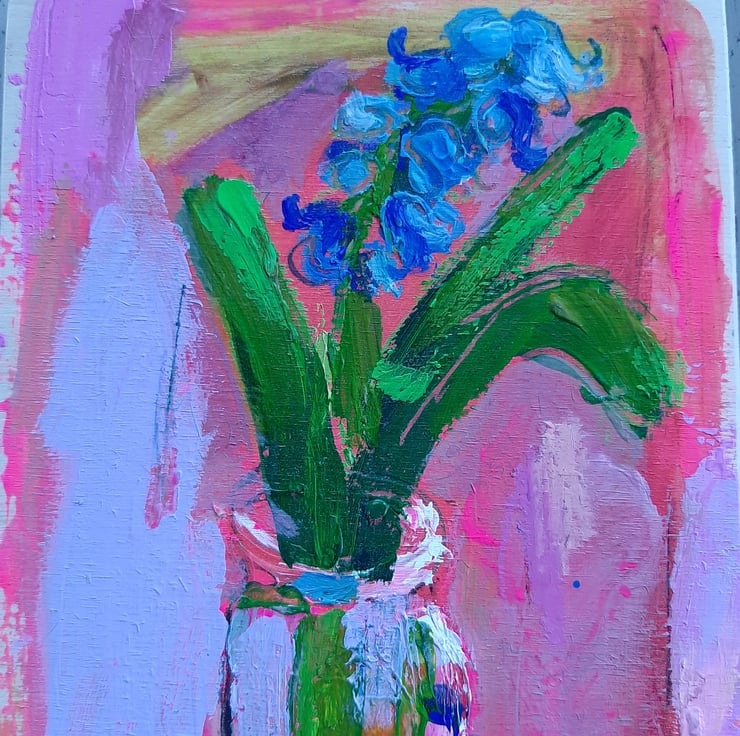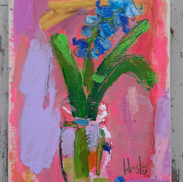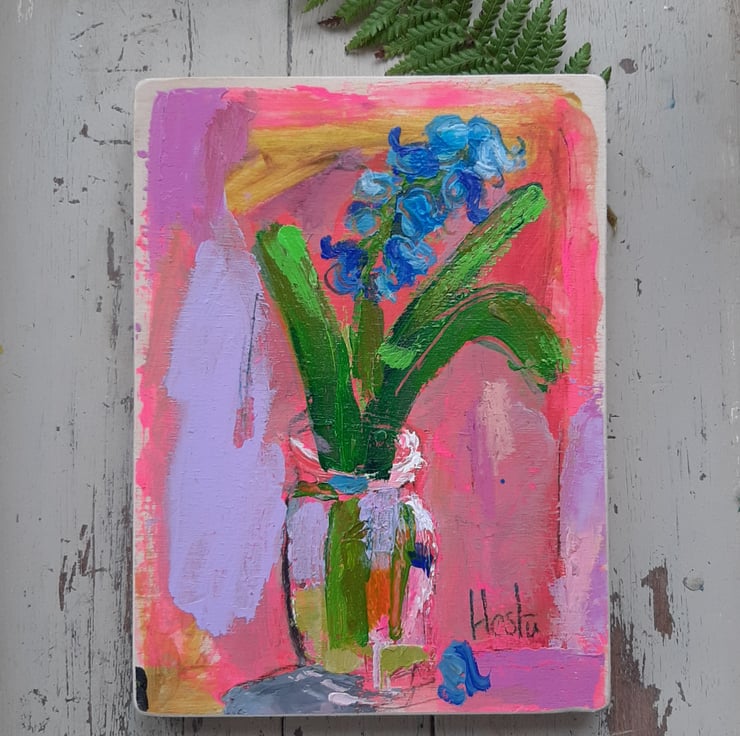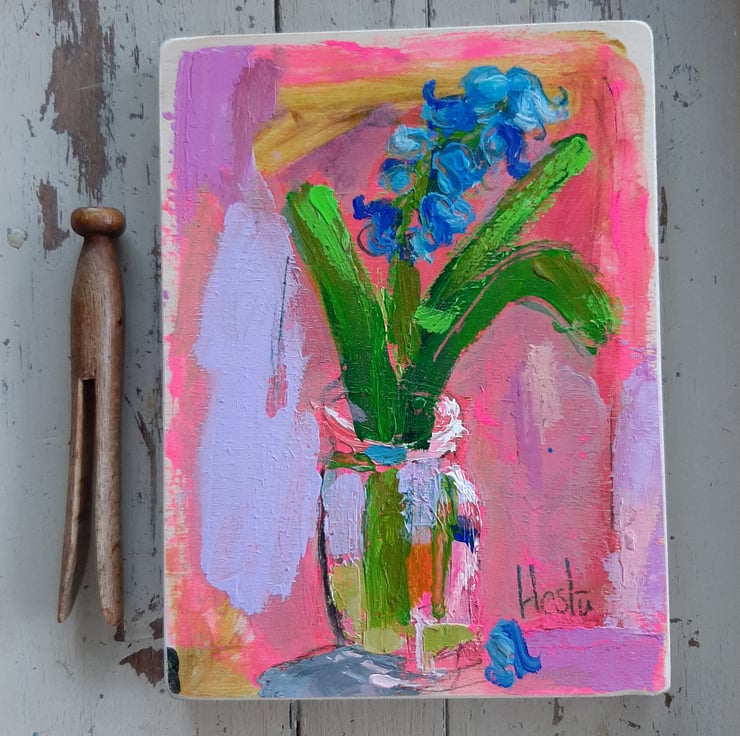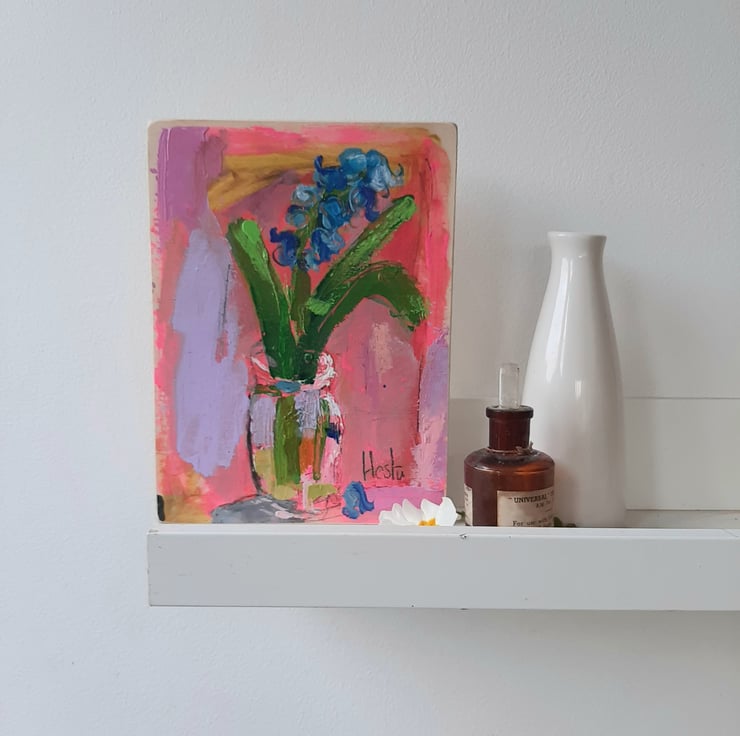 A bright colour pop in this lively still life. Confident brush work and a modern contemporary feel. I paint on thick reclaimed wood here. Sanded,varnished, signed and ready to hang. Joyful and vibrant. Measuring 2 cm.deep.15 cm wide and 21 cm tall