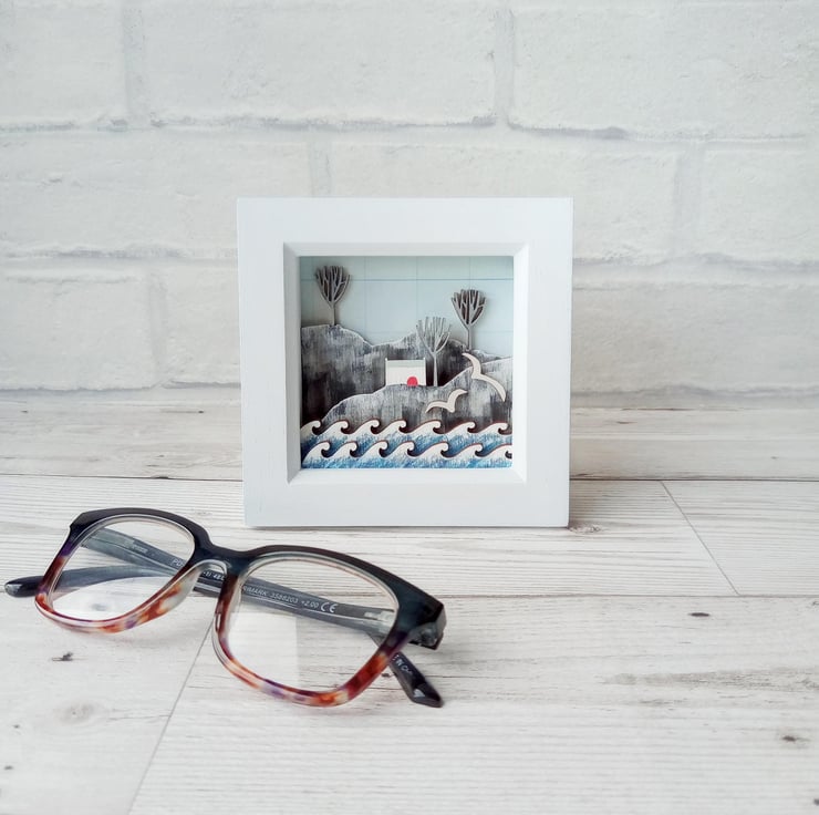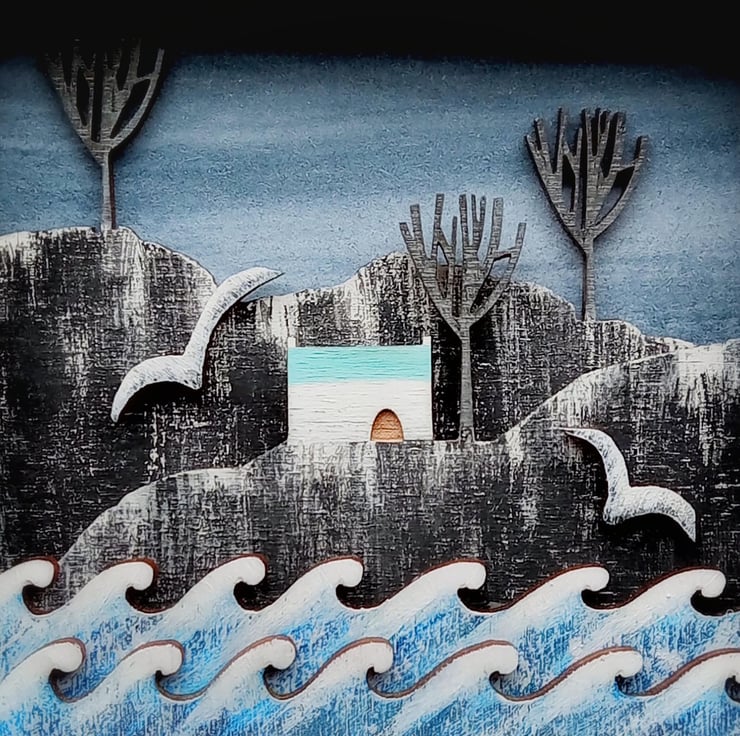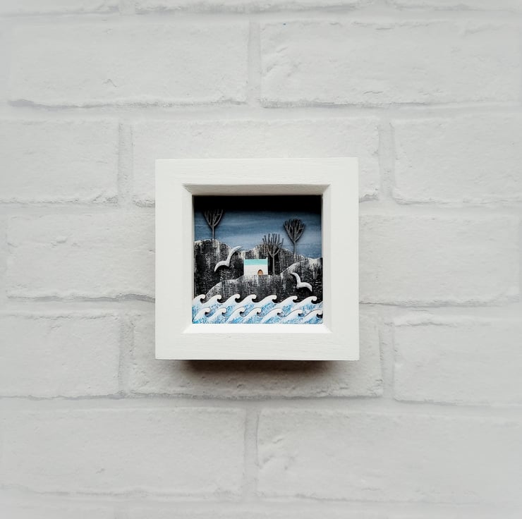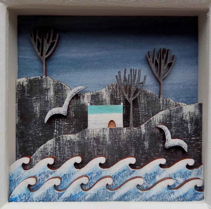 The design comes from original drawings which have been transformed into layers of laser cut wood, which I have then painted and screenprinted by hand and built up to form 3d layers and set into a white glazed wooden box frame, which measures approx. 12cm; the scene itself measures 8cm x 8cm x 1.5cm.