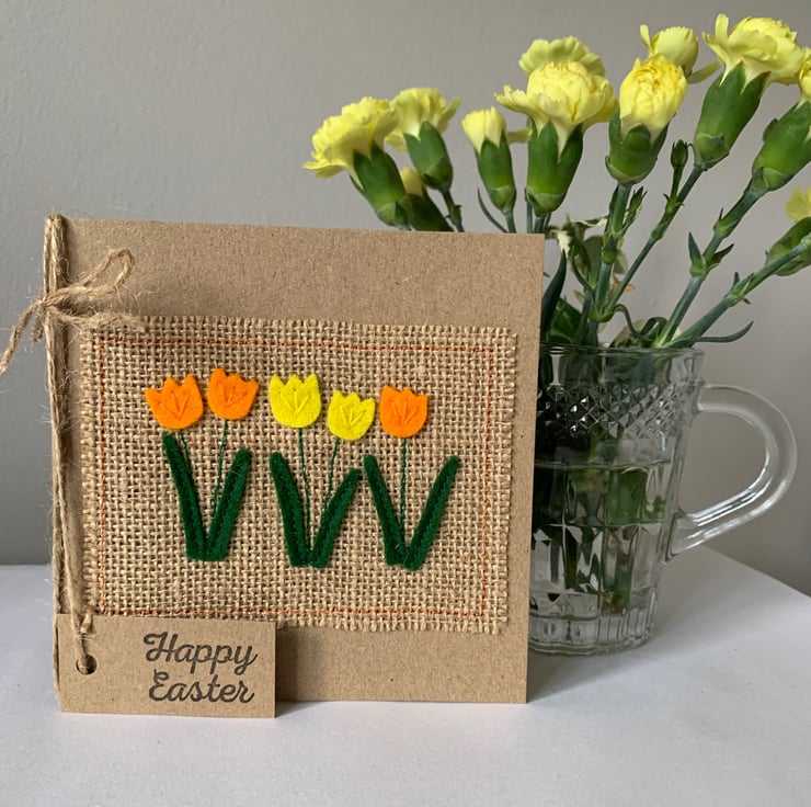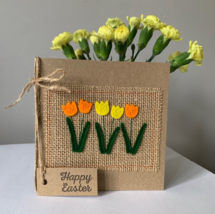 This card is decorated with a row of bright orange and yellow flowers. The decoration is hand cut from 100%wool felt and sewn by hand and machine onto a hessian background.