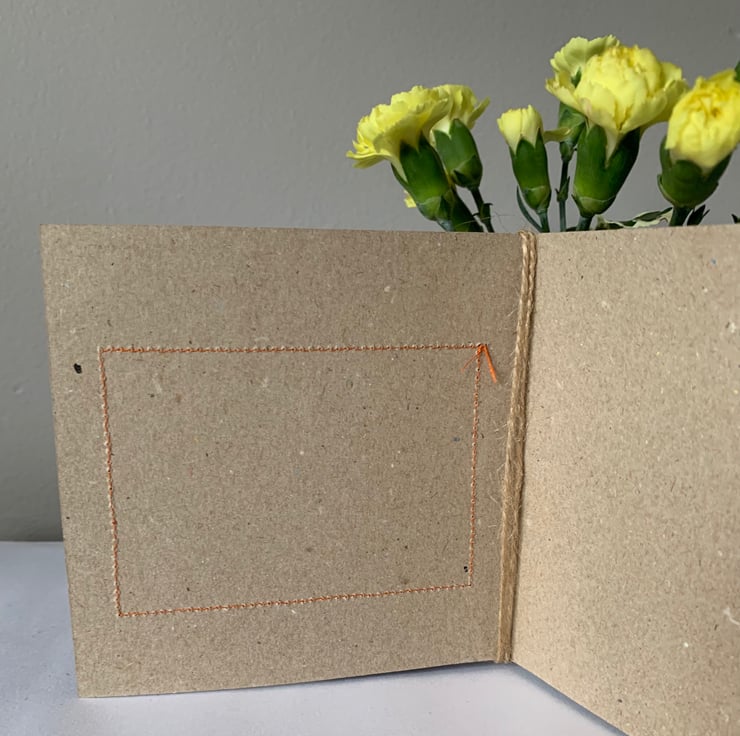 The hessian is machine stitched, using a contrasting thread, onto a plain brown recycled card. This stitching is visible on the inside of the card.