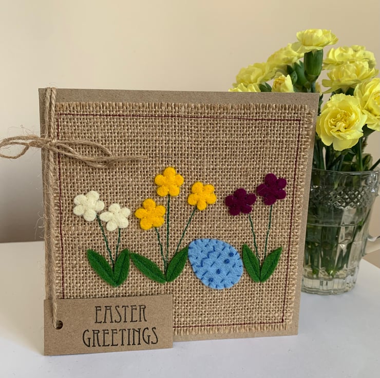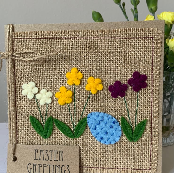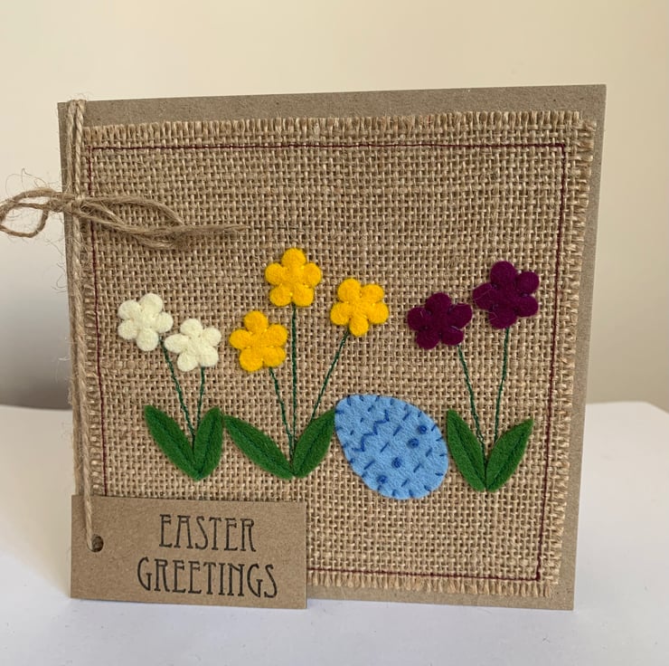 This Easter greeting card is decorated with flowers in cream, yellow and mulberry alongside a decorated sky blue egg. The decoration is hand cut from 100% wool felt and sewn by hand and machine onto a hessian background.