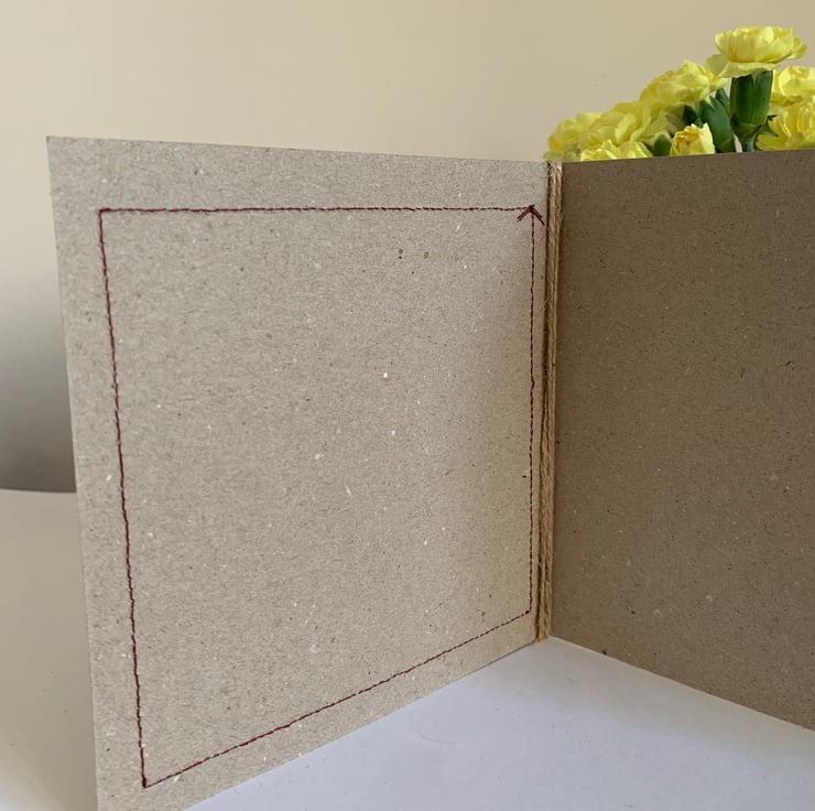 The hessian is machine stitched, using a contrasting thread, onto a plain brown recycled card. This stitching is visible on the inside of the card.