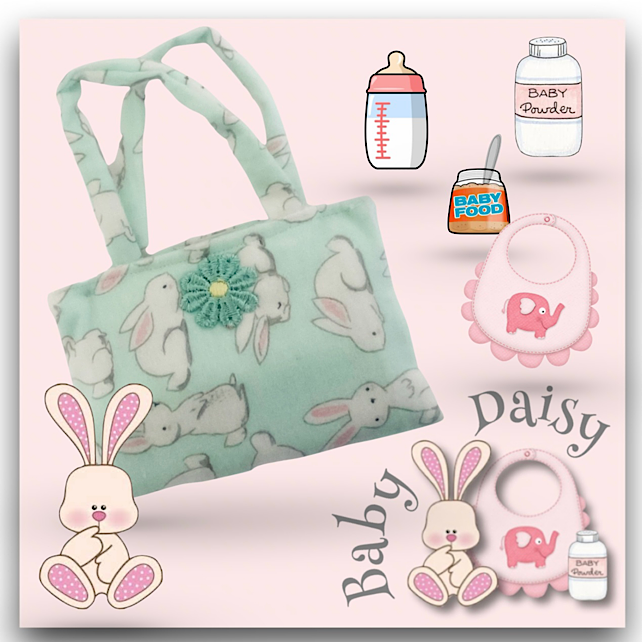 Just the sweetest little changing mat and felt accessories for baby Daisy. The changing mat folds in half and fastens with poppers to make a changing bag. The changing bag contains flat felt cut outs printed with baby Daisy’s toy rabbit, a feeding bottle, baby food, talcum powder and baby wipes. The changing mat is in a cute little rabbit print and is decorated with pretty daisies - just the thing you need for feeding and changing baby Daisy.
