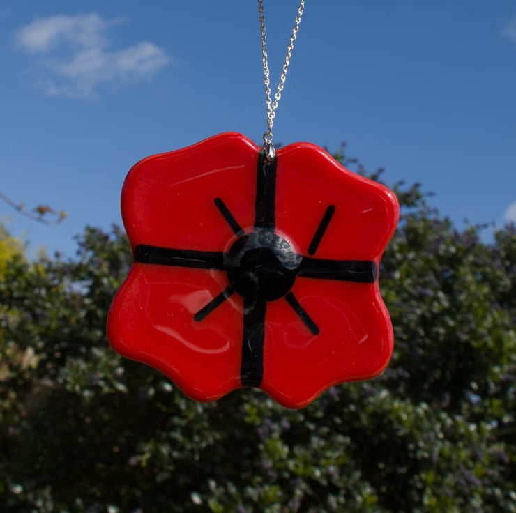 Each poppy is made from 4 hand-cut pieces of glass which are assembled with a pre-fused glass dot and glass rods to make the patterns. A 12-hour program of heating and cooling fuses the glass after which we drill a hole and fit a bail and the chain.
