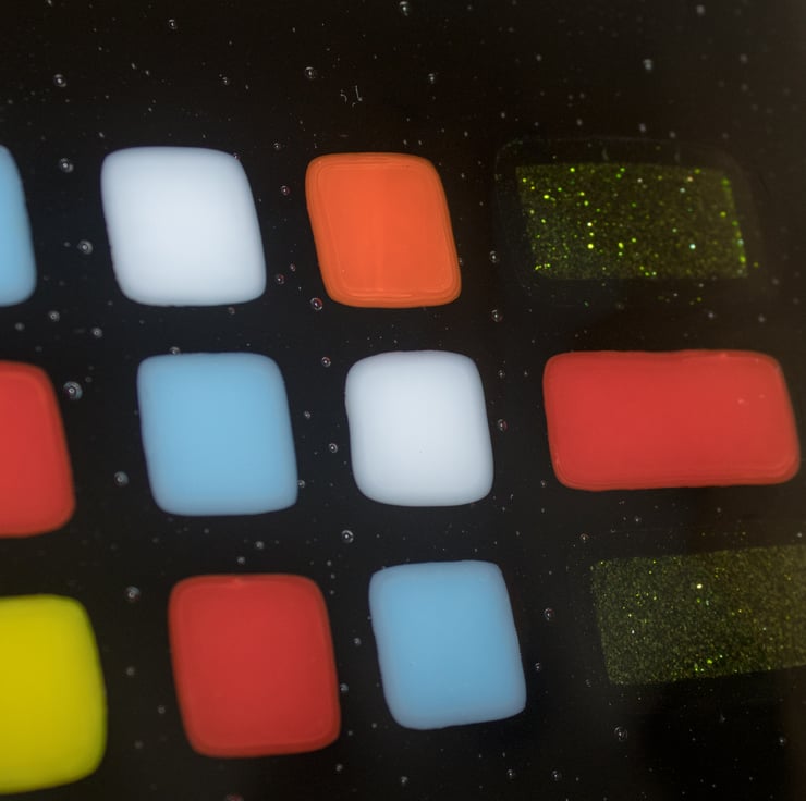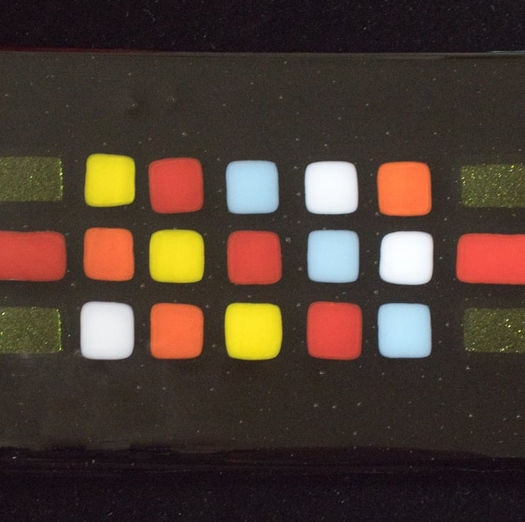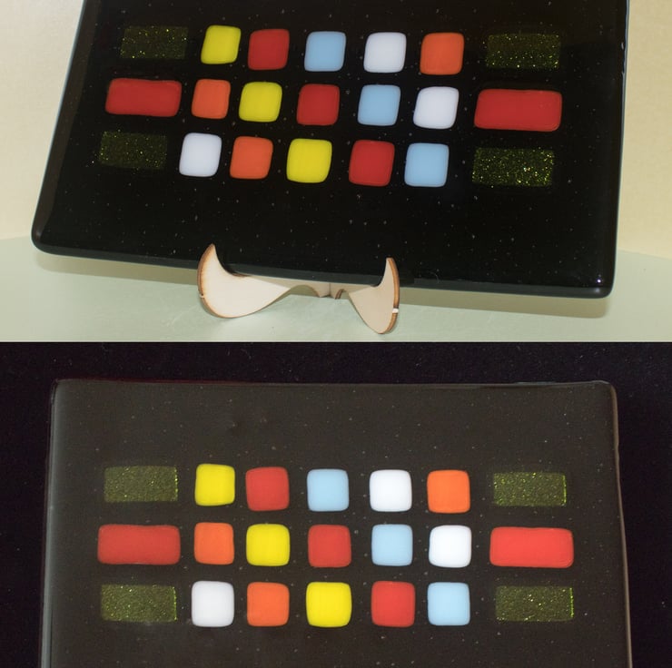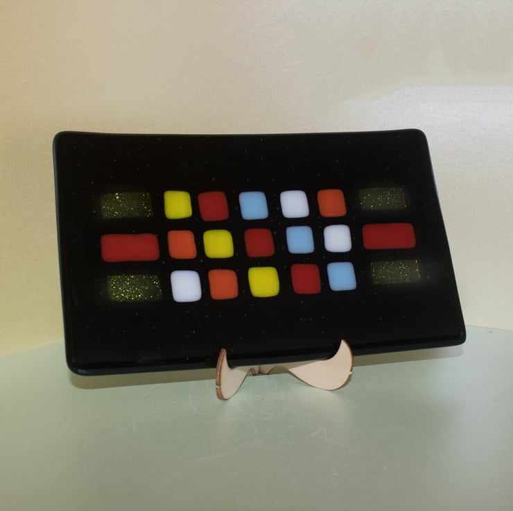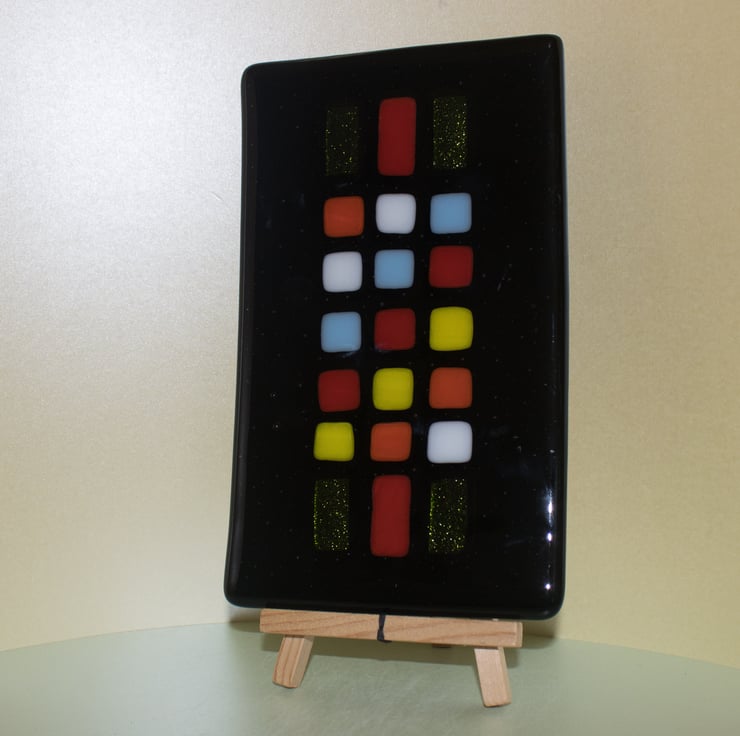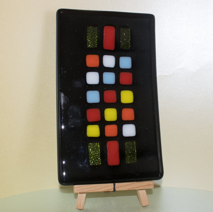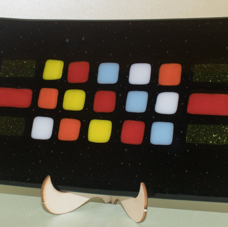 This plate, platter, dish (you decide) is constructed from a rectangle of black glass that has been capped with a matching piece of clear glass. We've then cut the coloured tiles and carefully laid them out in the pattern we wanted. A first trip to the kiln fused everything together and gives a smooth surface as the tiles melt into the base glass. Once cooled it goes back into the kiln for a second time where a mould gives it a slight dish shape.