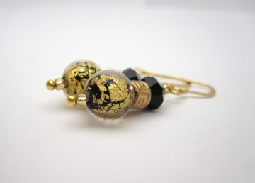 The rich black & gold colour of this jewellery is typical of Venetian glass. True black venetian glass is actualy a deep warm darkest aubergine colour giving it an unexpected warmth (but you willl need to look very closely to see it is not black). Set on a gold plated silver ear hooks. Copyright ©2021 DH Designs