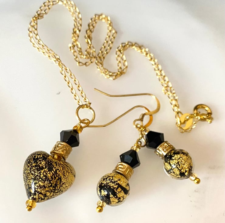 Necklace Earring Set Venetian Murano Glass Dark Black Heart and Spheres Gold plated Silver.