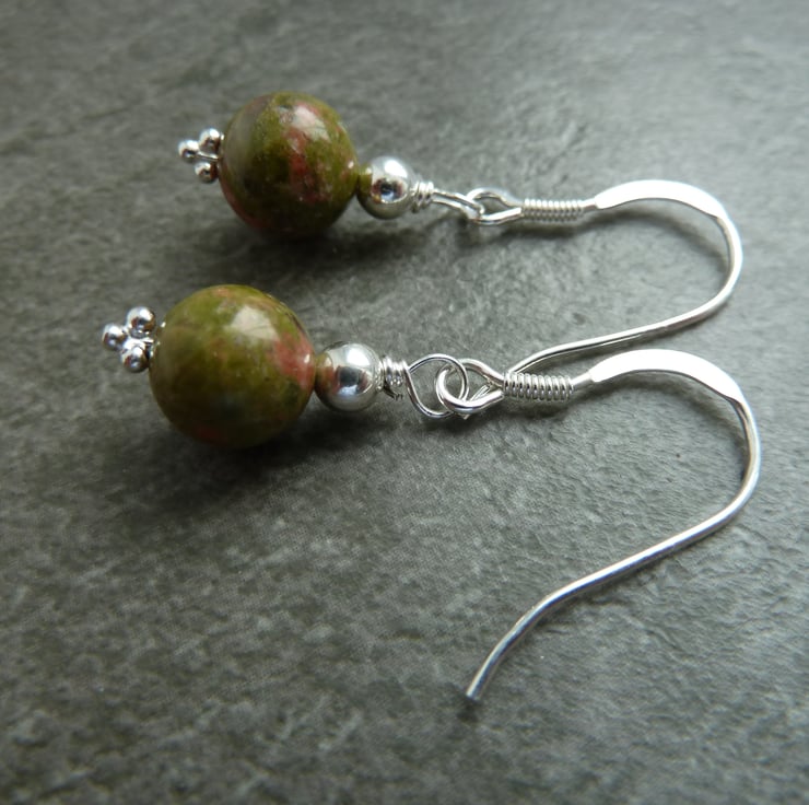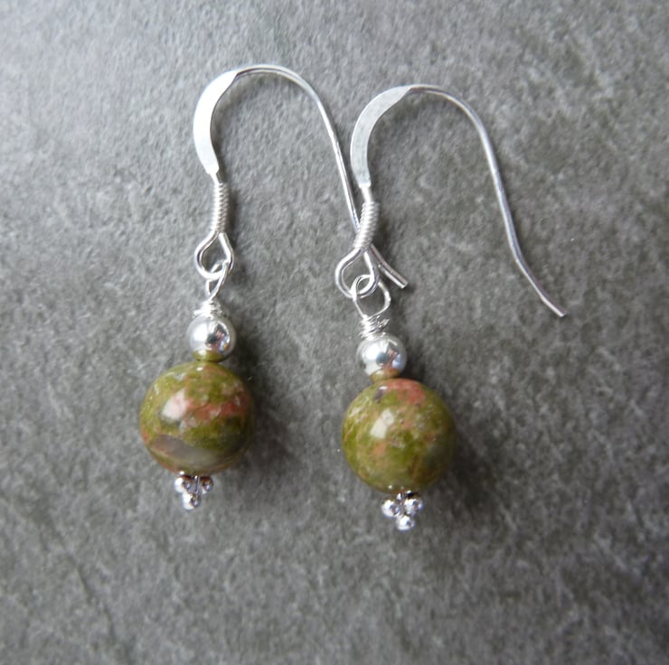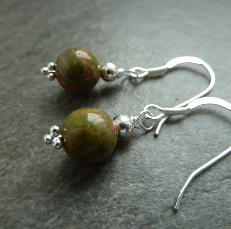A pair of sterling silver earrings featuring sterling silver beads and unakite beads.