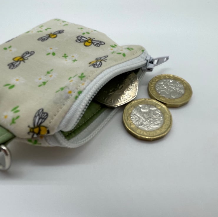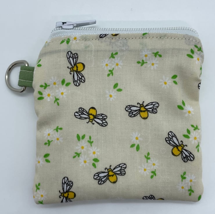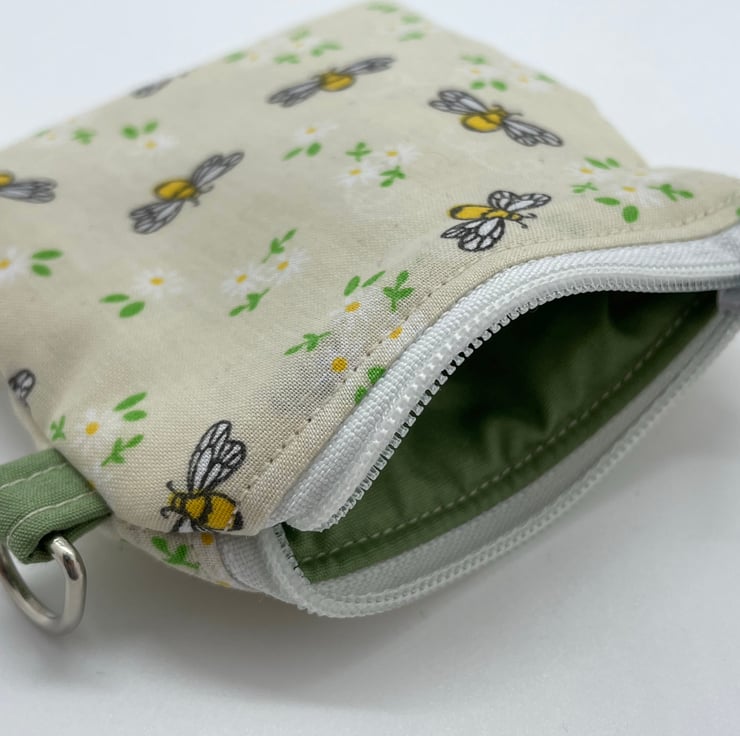 Small coin purse in a floral and bee fabric. Purse is padded and lined in green cotton. An external tab allows the purse to be attached to a bag or rucksack.