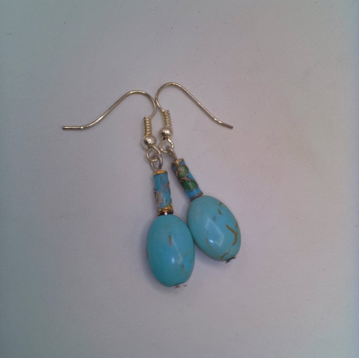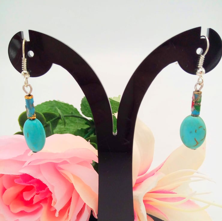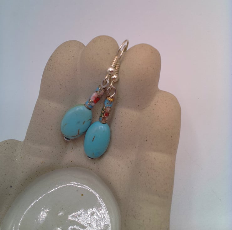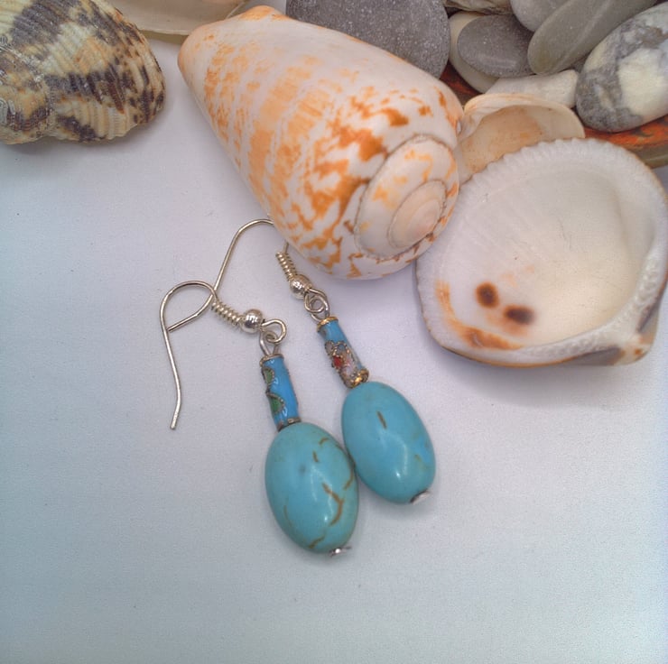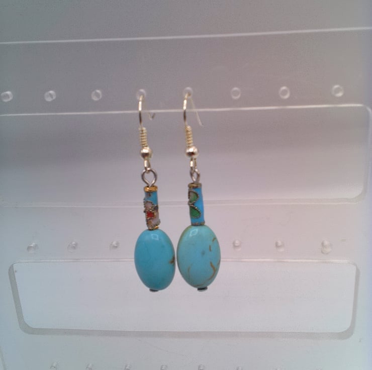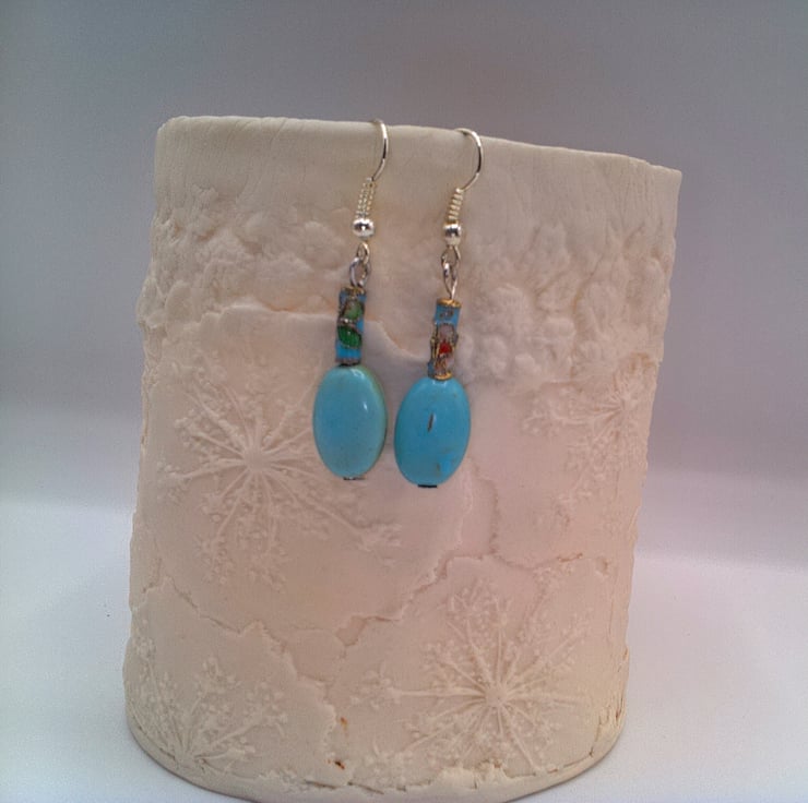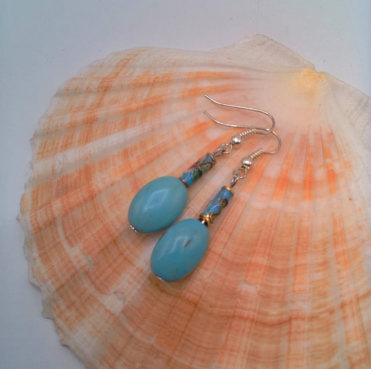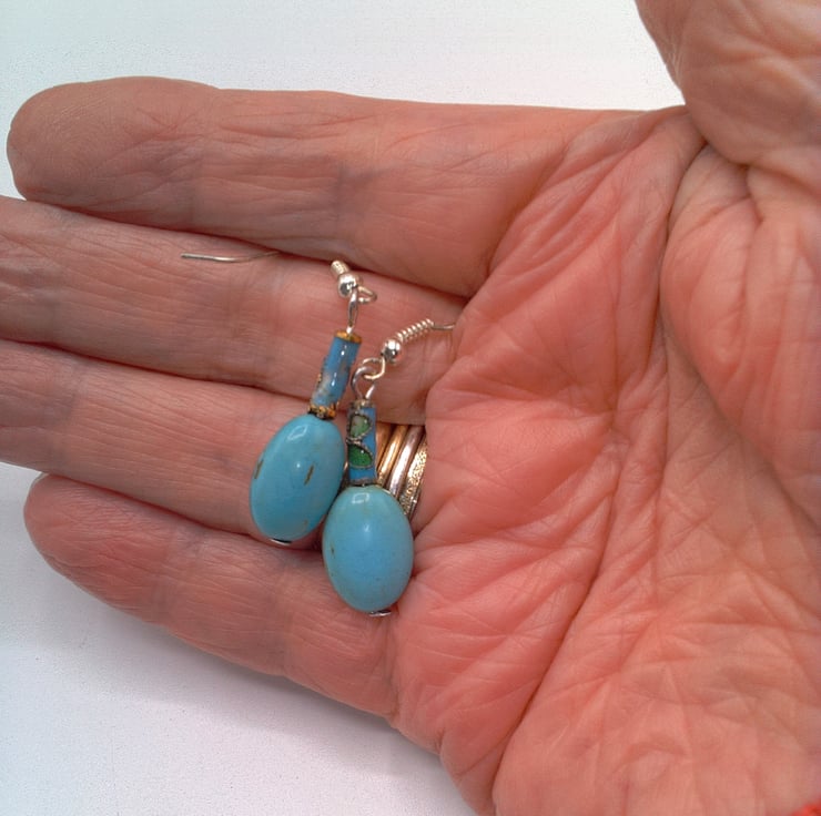 These pretty turquoise and cloisonne earrings would look great with any outfit you wear everyday or for an evening out. They would make a lovely gift for a friend or relative for a birthday or anniversary, or a treat for yourself. They are made using 15 mm oval turquoise beads with 10 x 4 mm blue cloisonne tube beads and silver plated ear wires. They have a drop of 3.25 cm from the base of the ear wire. The earrings will be dispatched wrapped in tissue paper in an organza bag and delivered to you via Royal Mail first class post.