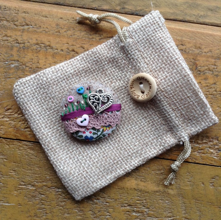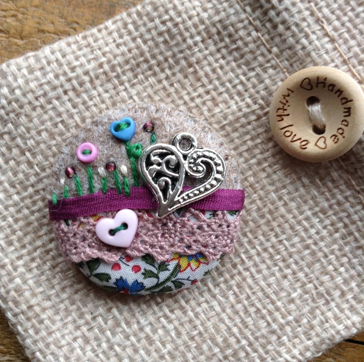 I have embellished a circle of wool blend heathered felt with Liberty fabric, crochet lace, silk ribbon, an embroidered button and bead meadow and a silver metal heart charm.