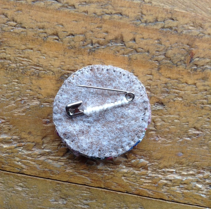 Attached to clothing with a safety pin. Measures approximately 3cm diameter.