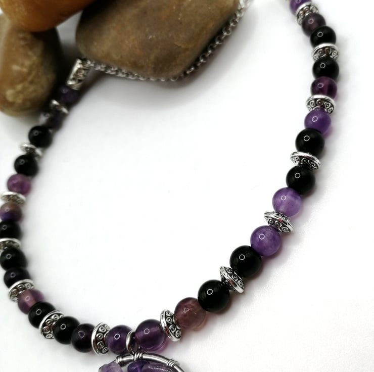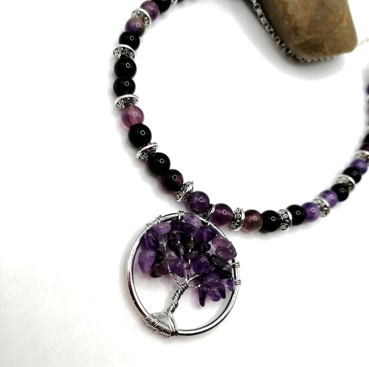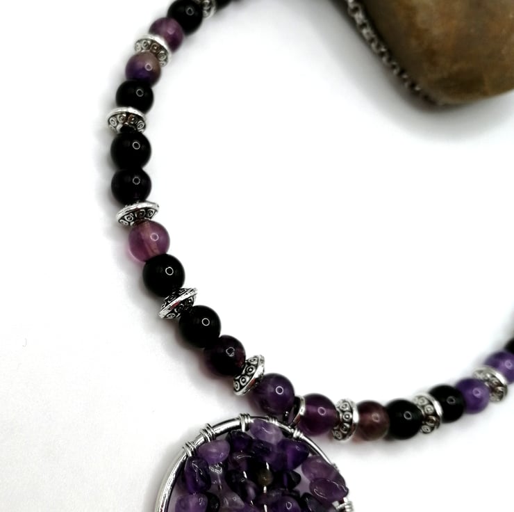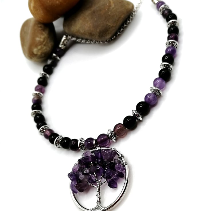 This beautiful necklace is made from amethyst and agate beads. The gemstone chips on the tree are also amethyst. I can make this to any length. Please leave me a message with your choice of length. If I do not receive a message I will send as 18 inches.