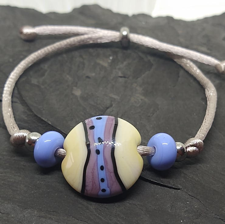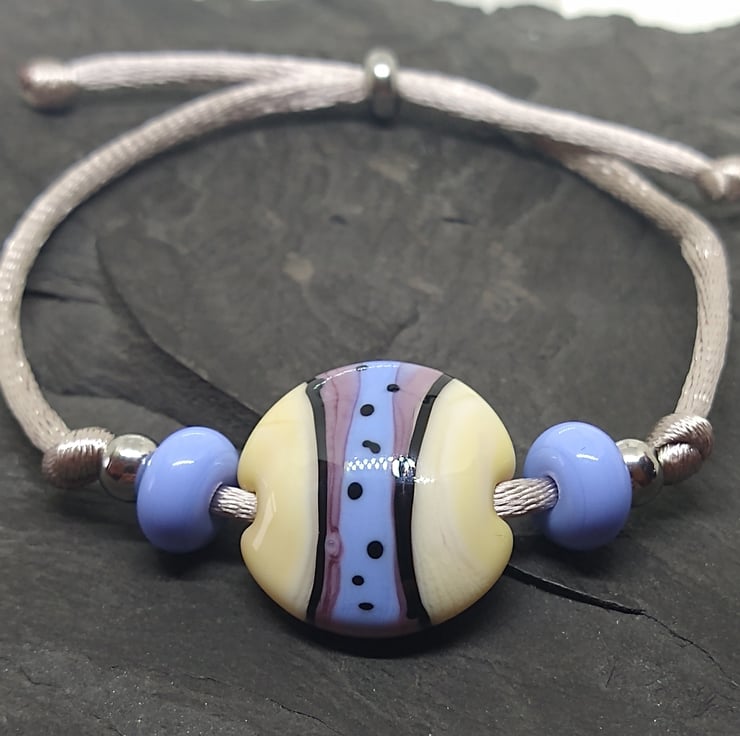 Large disco style lampwork lentil bead in ivory, pale blue and violet with black details. I have teamed it up with matching spacer beads and stainless steel slider beads. These beads are made to order by hand which means there will variations between each one making your bead unique to you. The disco lentil will measure approx 19mm across.