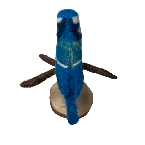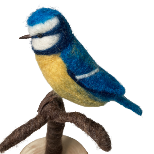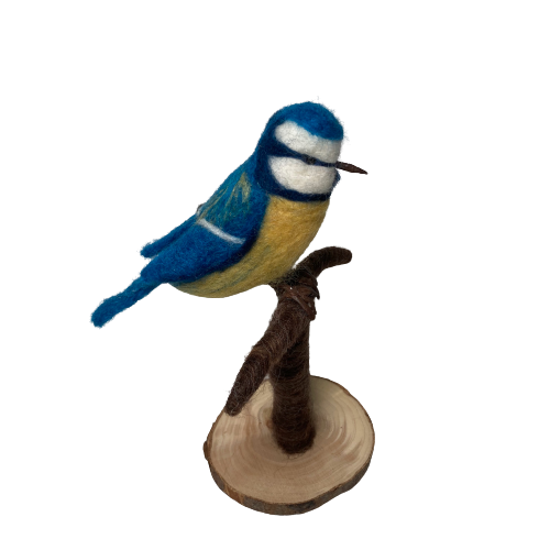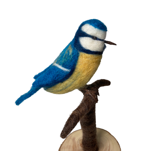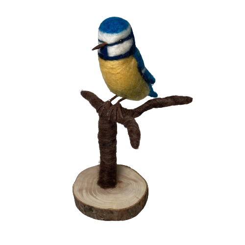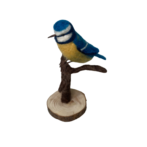 Needle felted from woollen fibres using a barbed felting needle. A core of white woollen fibres has been sculpted into shape and then a top coat of merino wool in appropriate colours added. The blue tit has wired feet and beaded eyes. A perch has been created using brown wool needle felted over a wire armature and the blue tit mounted on it. The whole ornament has then been mounted on a rustic wooden base.
