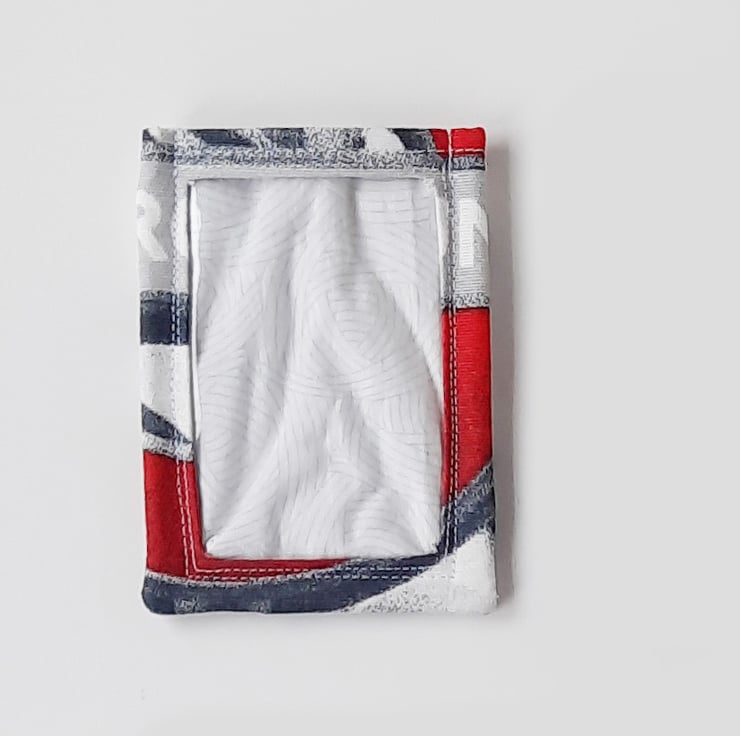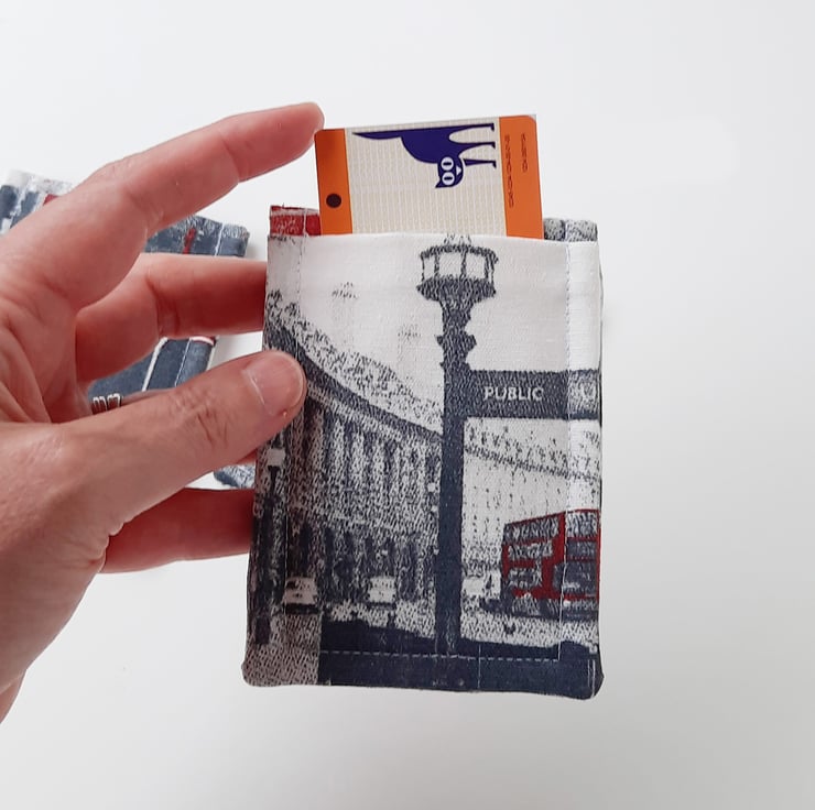 The travel card holder was a customers idea! They had seen my ID holders, and wanted one without the loop so they could put their travel card in. Then I found this amazing London fabric that was being thrown out and rescued it.