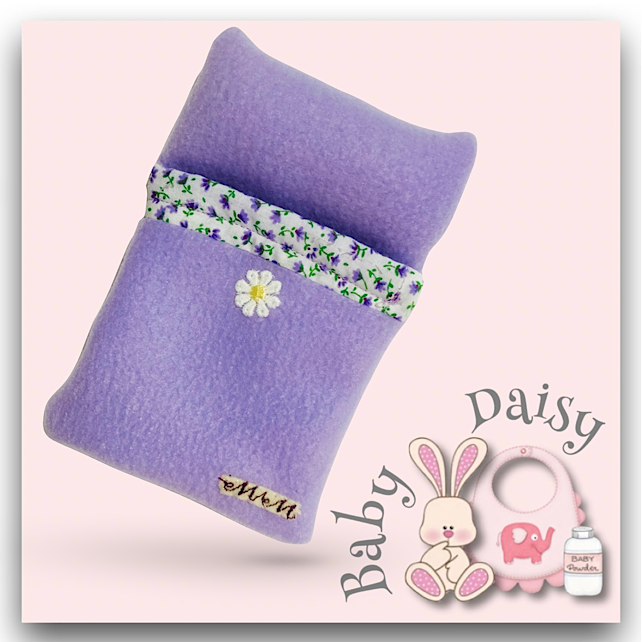 A cosy little lavender sleeping bag for baby Daisy. The sleeping bag is handmade from warm lavender fleece with a cotton trimmed edge in a lavender sprig print. It is decorated with a little daisy and is just the thing you need for bedtime or popping baby Daisy in for a little nap during the day.