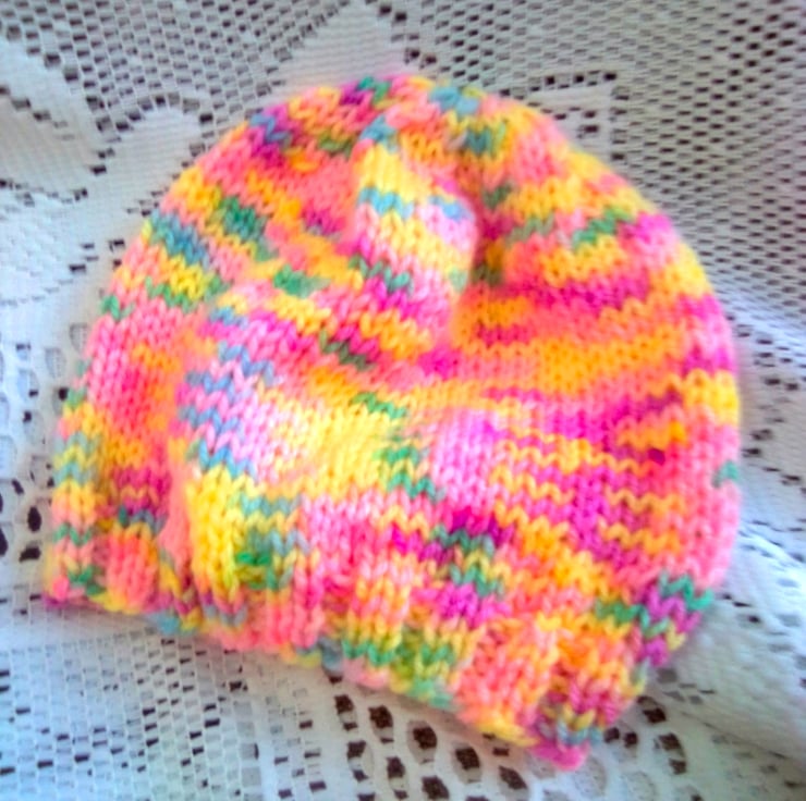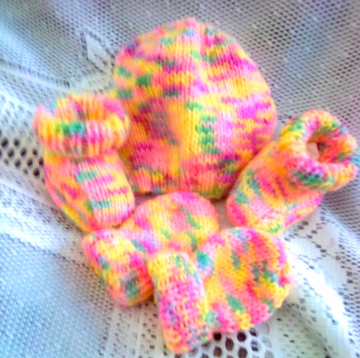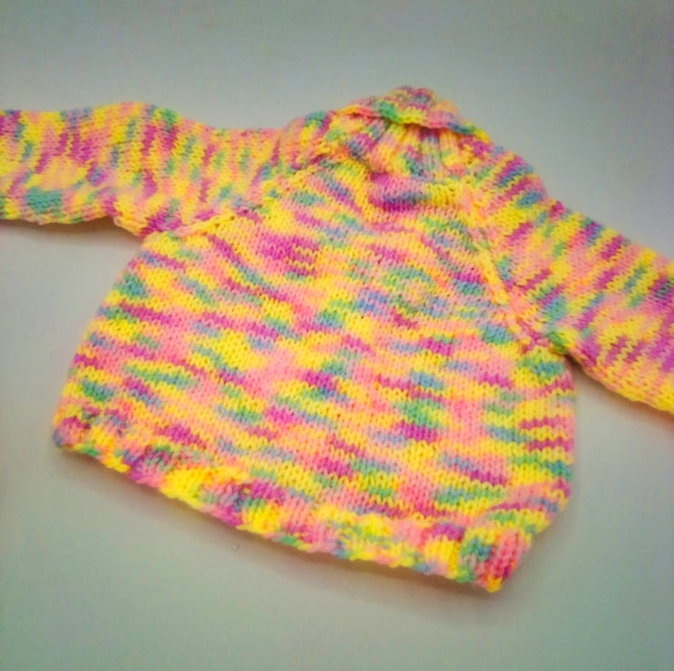 A cute 4 piece cardigan set comprising a Cardigan with an attractive shawl collar, pull on hat, booties and mittens for a baby made using a varigated mixture yarn. This set is in stock in the colours shown or it can be hand knitted for you in a size and colour of your choice, please state colour required when you order. Available sizes are shown below. The processing time to produce this and post out to you will be between 1 and 2 weeks.