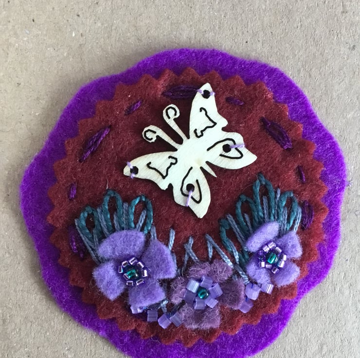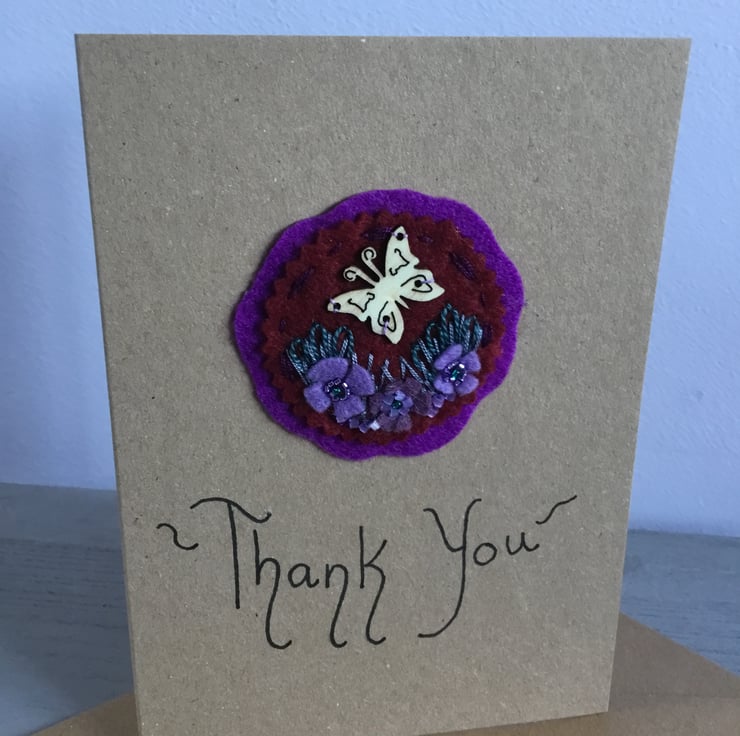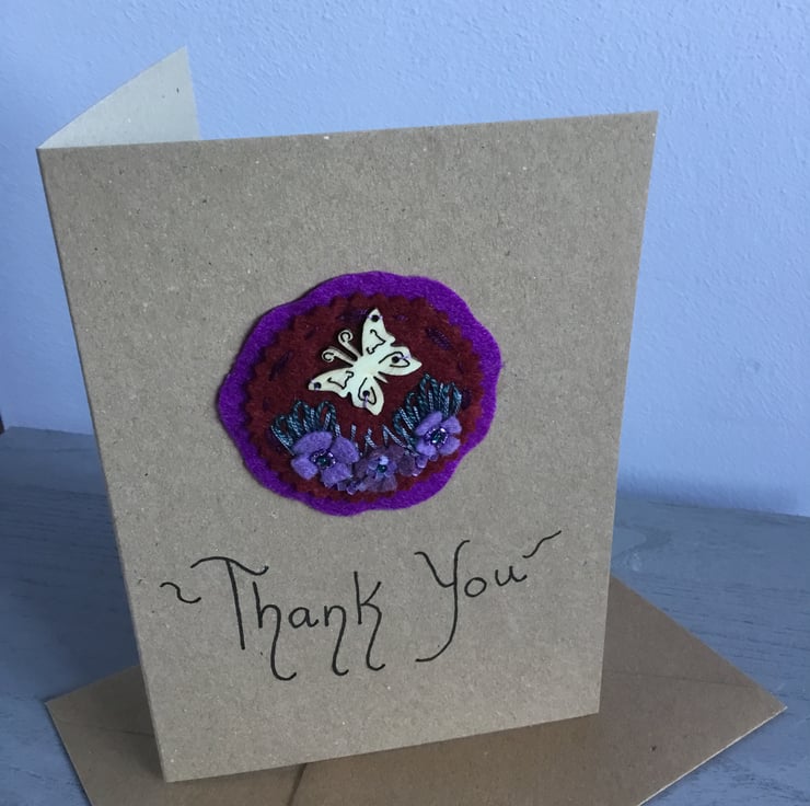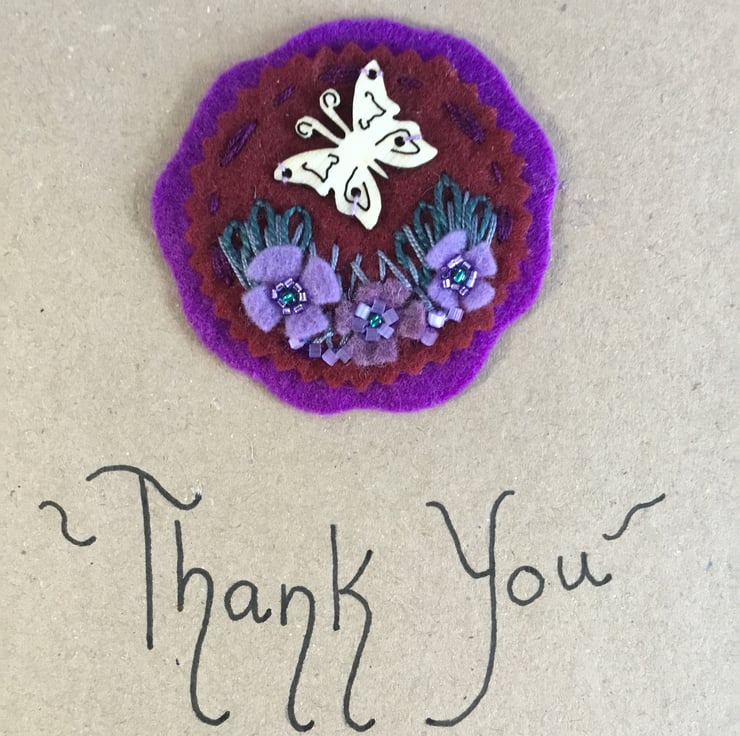 This Hand Embroidered Butterfly Thank You Card has a special hand embroidered ‘thank you’ message......a wooden Butterfly flutters over a border of lilac and purple flowers in circles of berry red and amethyst coloured felt. These flowers have beaded centres, surrounded by hand embroidered leaves.