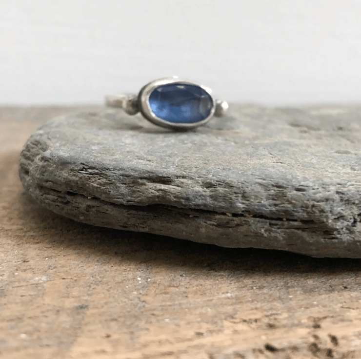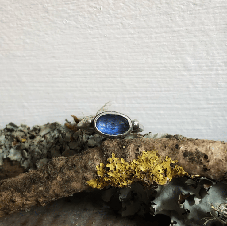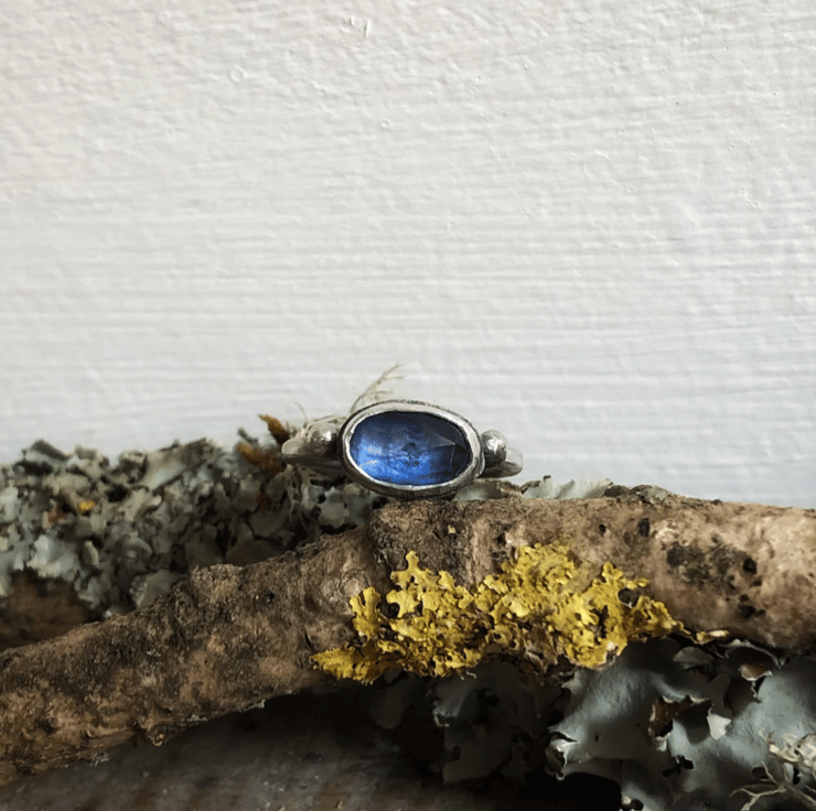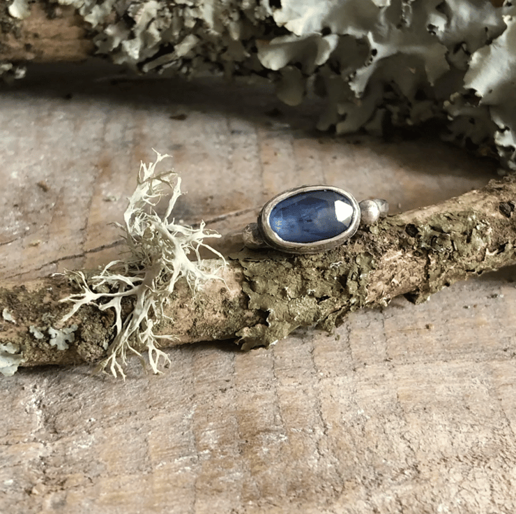 I love this delicate kyanite ring. The stone is oblong, roughly 8x12mm, set in sterling silver with two silver embellishments on each side. The kyanite is a deep blue but it's a rose cut cabochon so is faceted on top and will sparkle in the light. It can be worn alone or with other stackable rings as pictured.