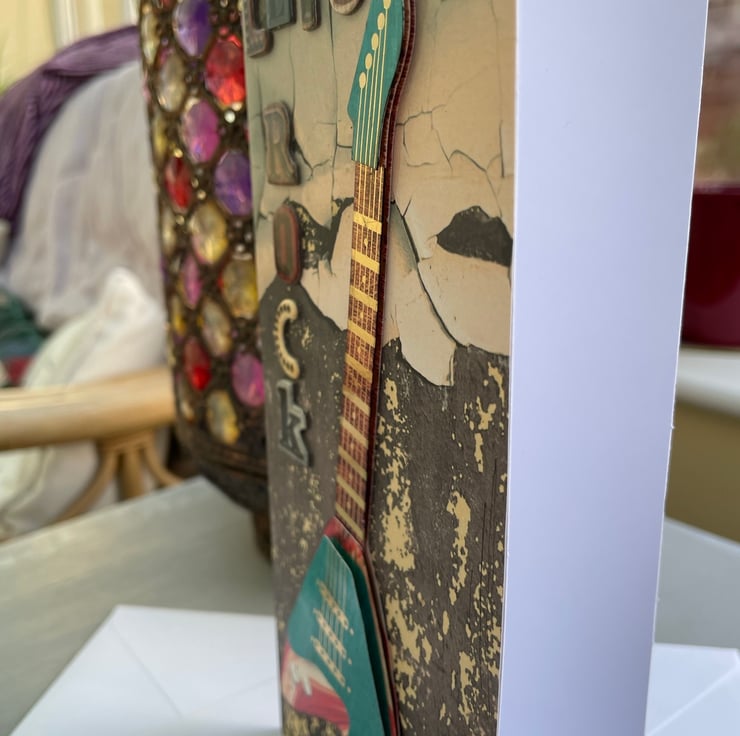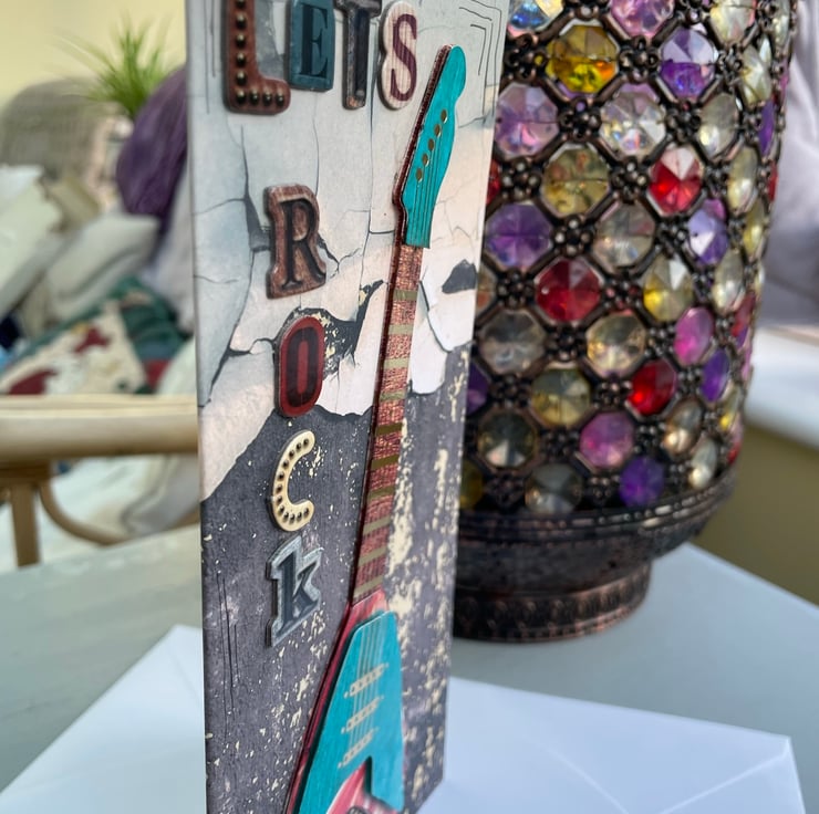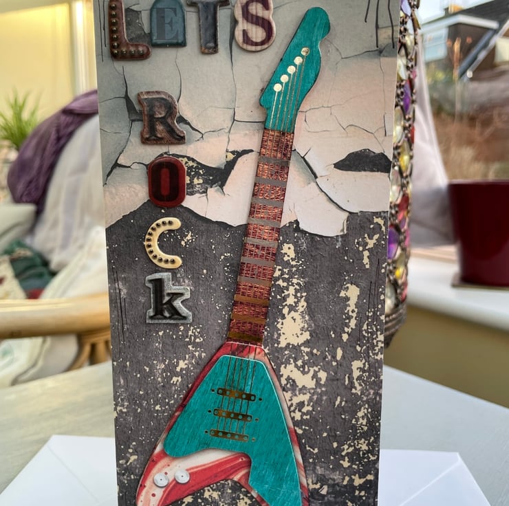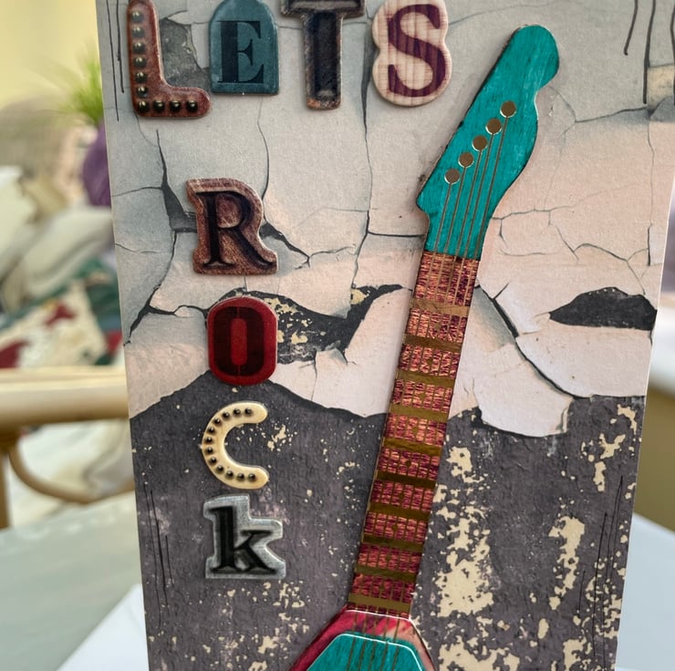 A little rock and roll. This DL sized card features an electric guitar, a very 70's style one at that. It is in red and turquoise and sits upon a shappy' flaking paint background. It has Lets Rock on the front in grungy mismatched sticky letter tiles, this completes thae grungy look. A great card for any rocker or guitarist out there!