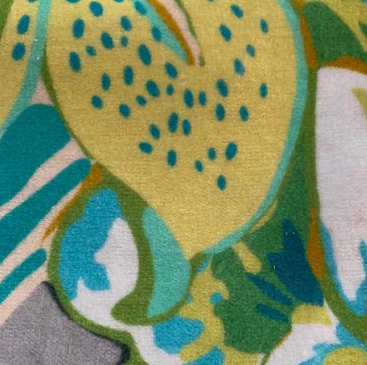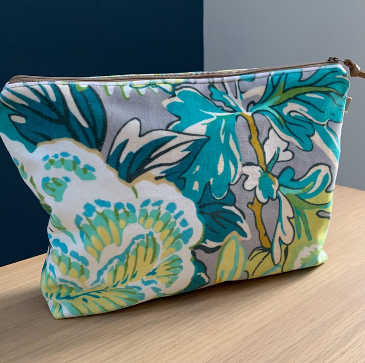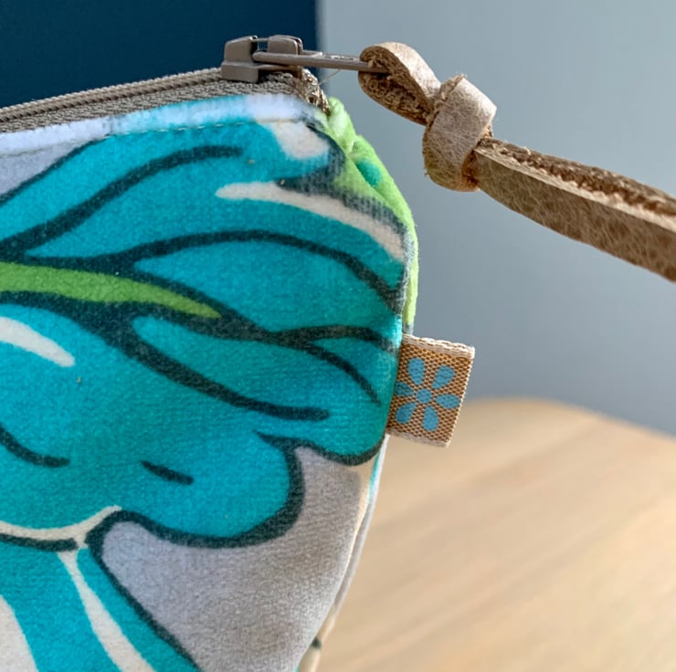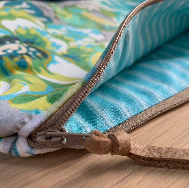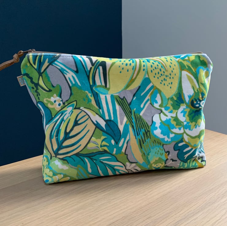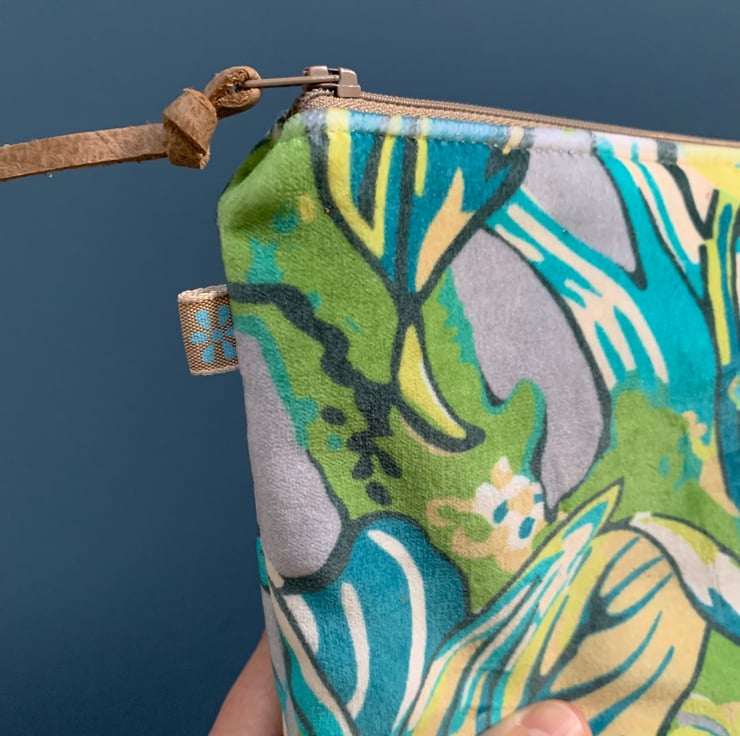 This soft pouch is made from pretty cotton-rich velvet with an tropical leafy design in blues and yellows. It is finished with a striped cotton lining.