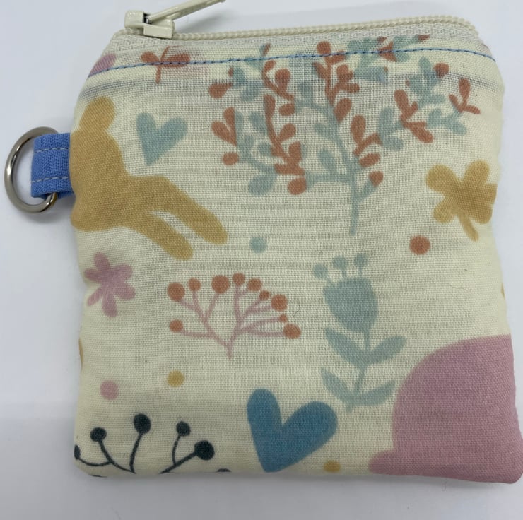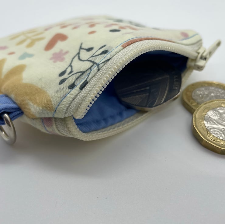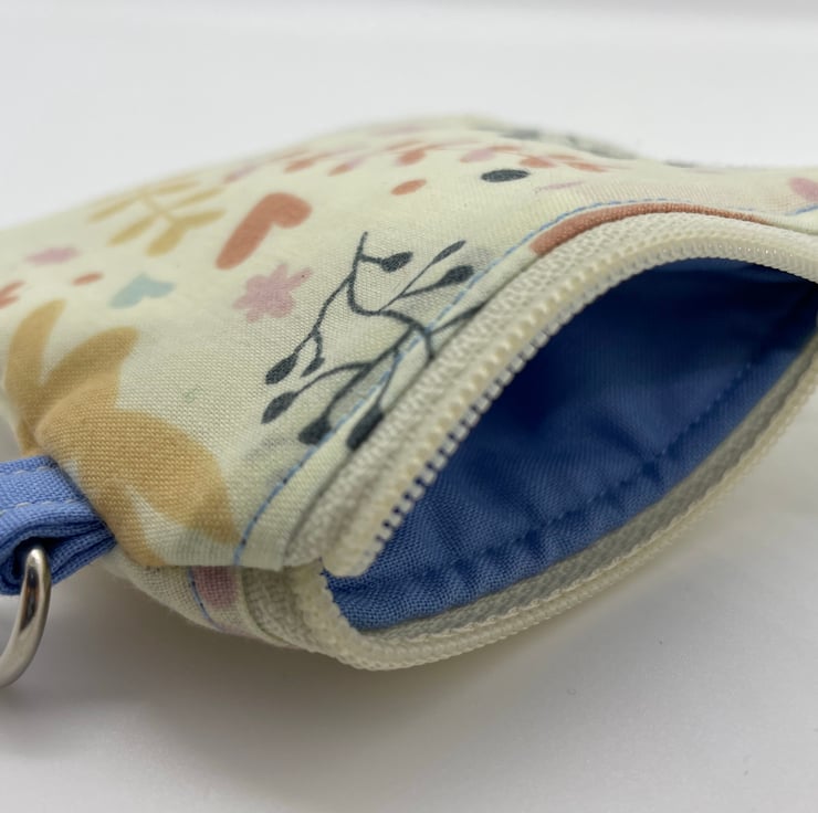 Small coin purse in a floral fabric. Purse is padded and lined in blue cotton. An external tab allows the purse to be attached to a bag or rucksack.